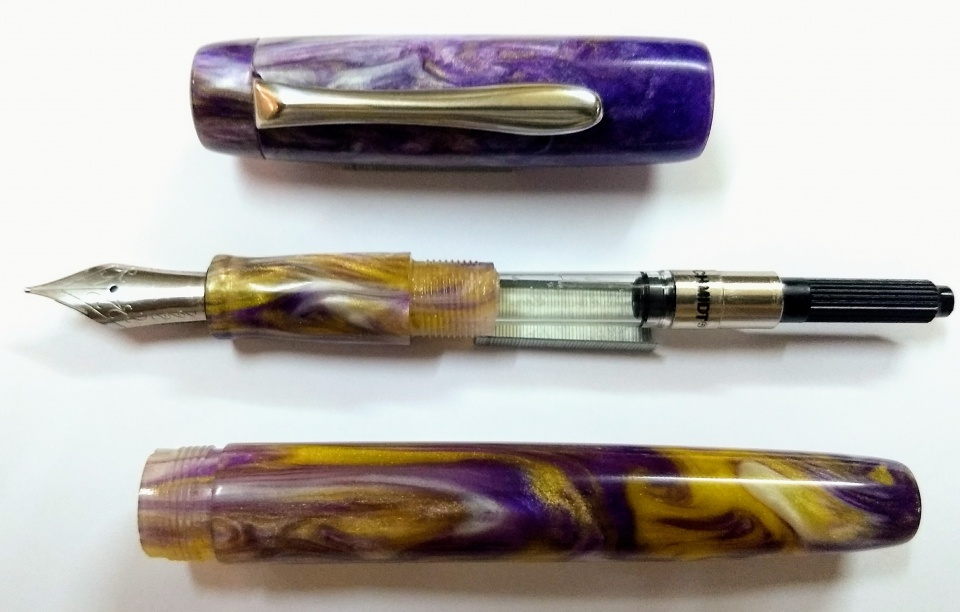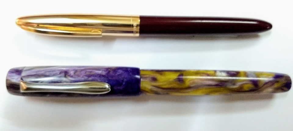 Made one pen last night. Woodshed Poly resin blank , Jowo 6 nib unit and Schmidt k5 converter. I like the way the blank shows the colours. Moderate size as shown in the comparison photo. Hope you like the design. Welcome comments and criticisms.
