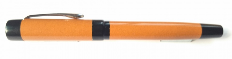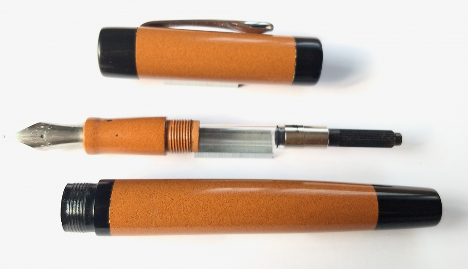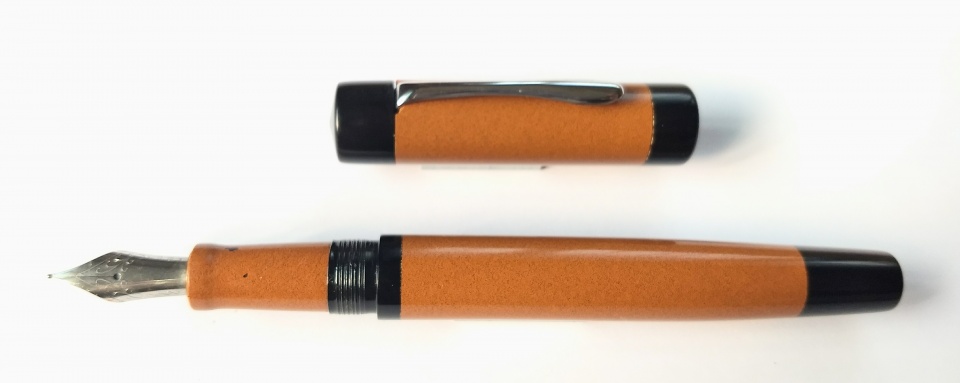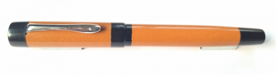 This pen made in premium ebonite looks rather subdued in colour, tan and black is not exact ly pleasing, I would like the tan more in the orange side. Otherwise , it is a long pen ,92mm barrel, 14.5 mm barrel diameter and 16.6 mm cap diameter. Jowo6 nib unit and Schmidt k5 converter. Retro looks!
