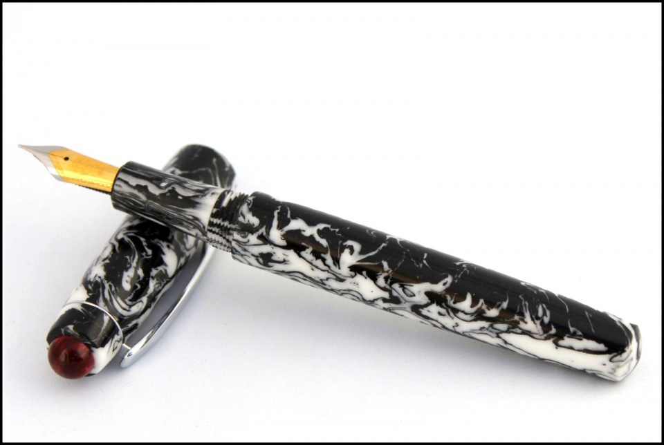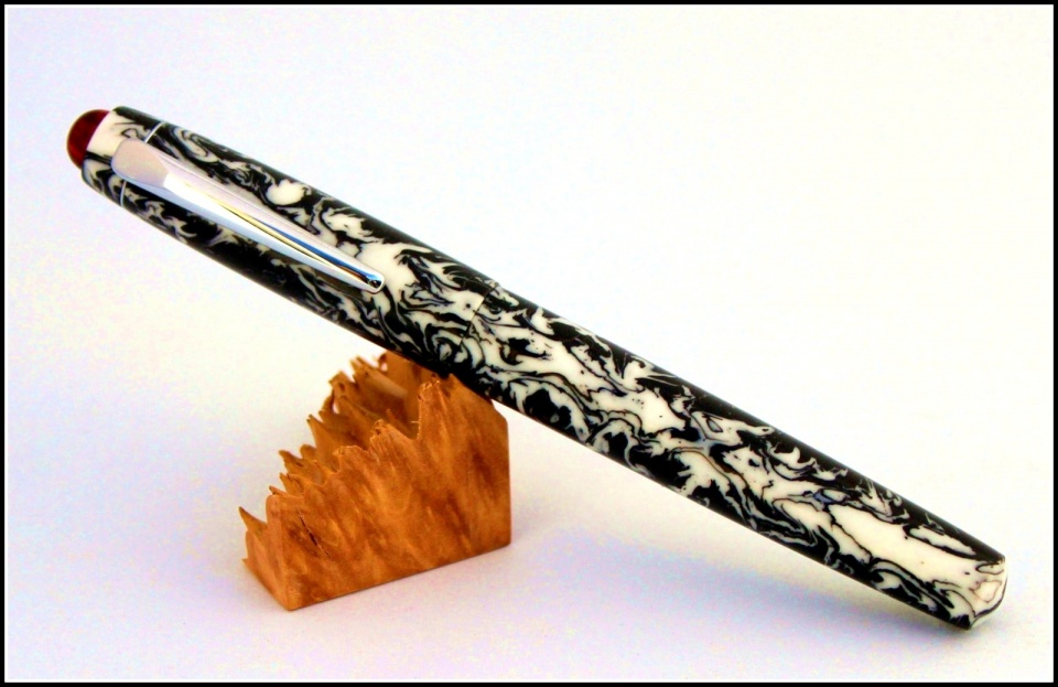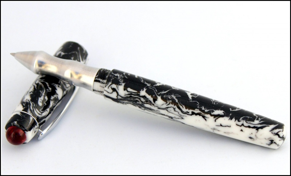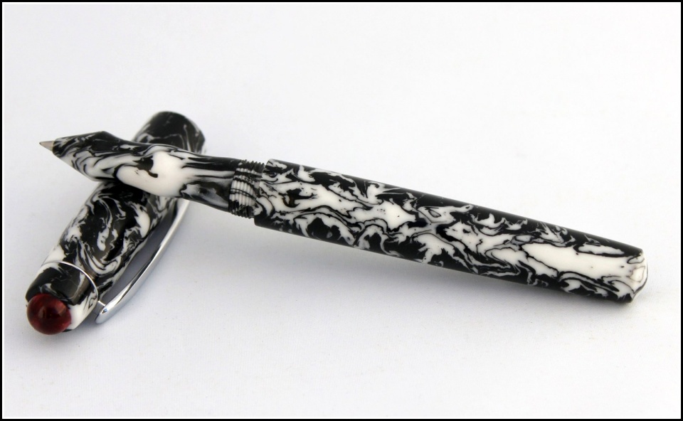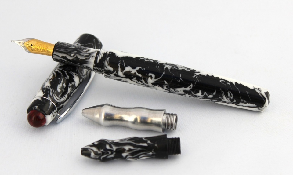 This is a kit-less black and white Alumilite with a red finial. I made it with three different sections. A combo FP #6 Bock nib. RB with matching B&W section. RB custom aluminum section. C & C welcome. Thanks for looking, Evan