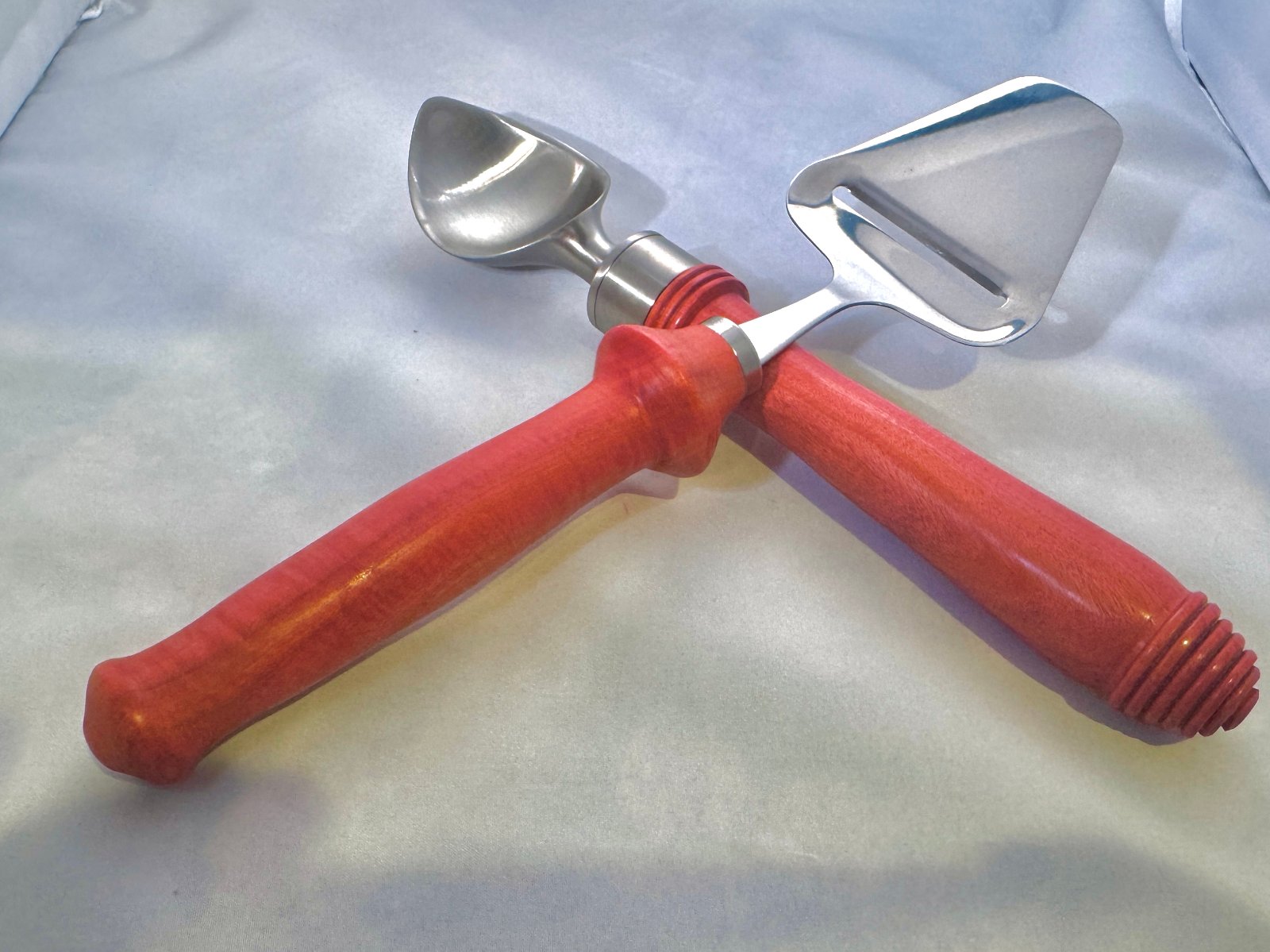 A couple of kitchen gadgets heading to Maui for my daughter. She is a big fan of all things pink, so I made the handles from Pink Ivory. Sorry for the sketchy photo.