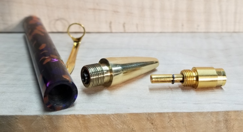 Here's a kitless clicker I just finished. I put it on the backburner for a while to work on other stuff. It's vintage Cebloplast Celebration with a Schmidt click mechanism. The nose cone was turned from solid brass rod. The clip is a teardrop.