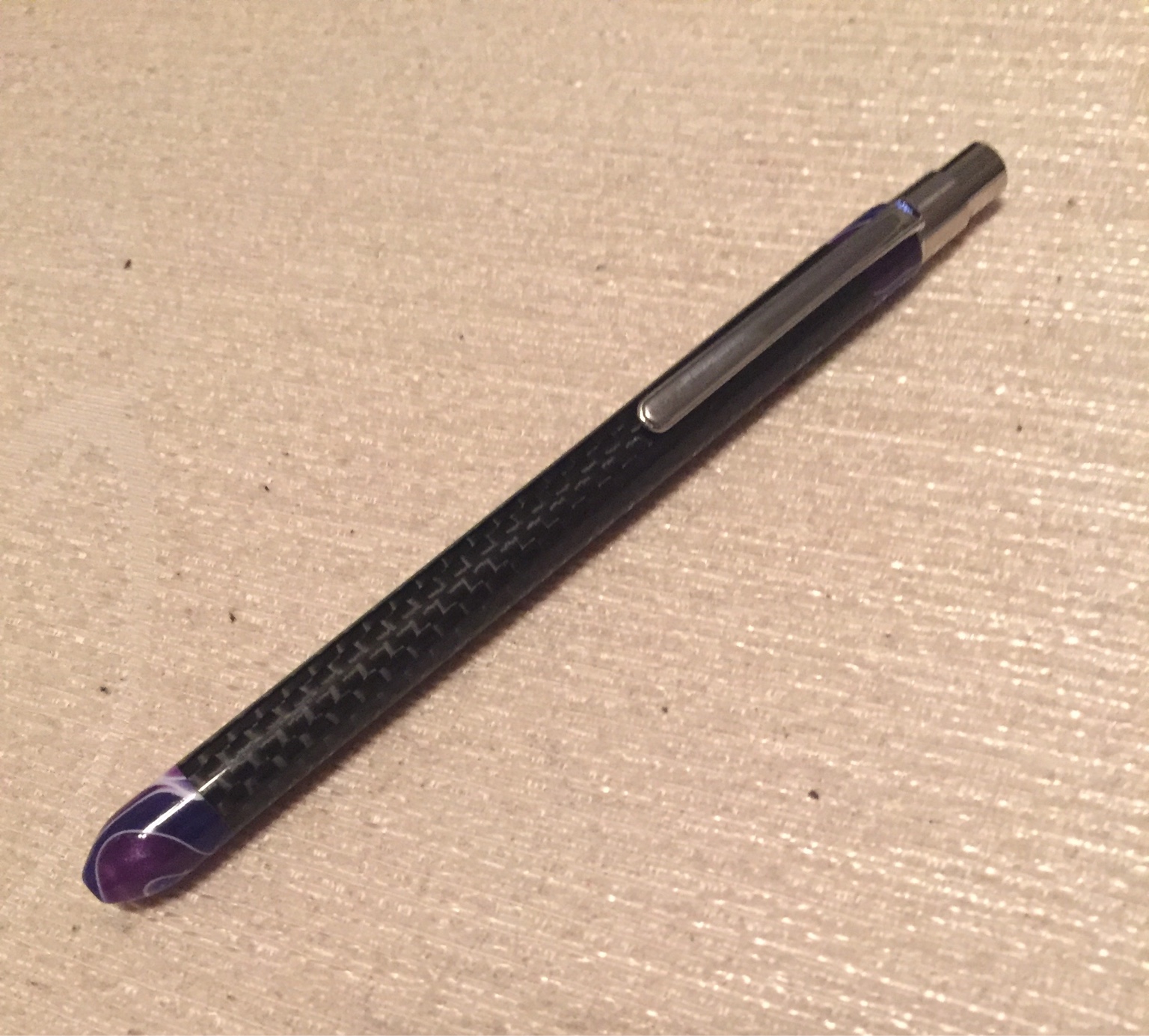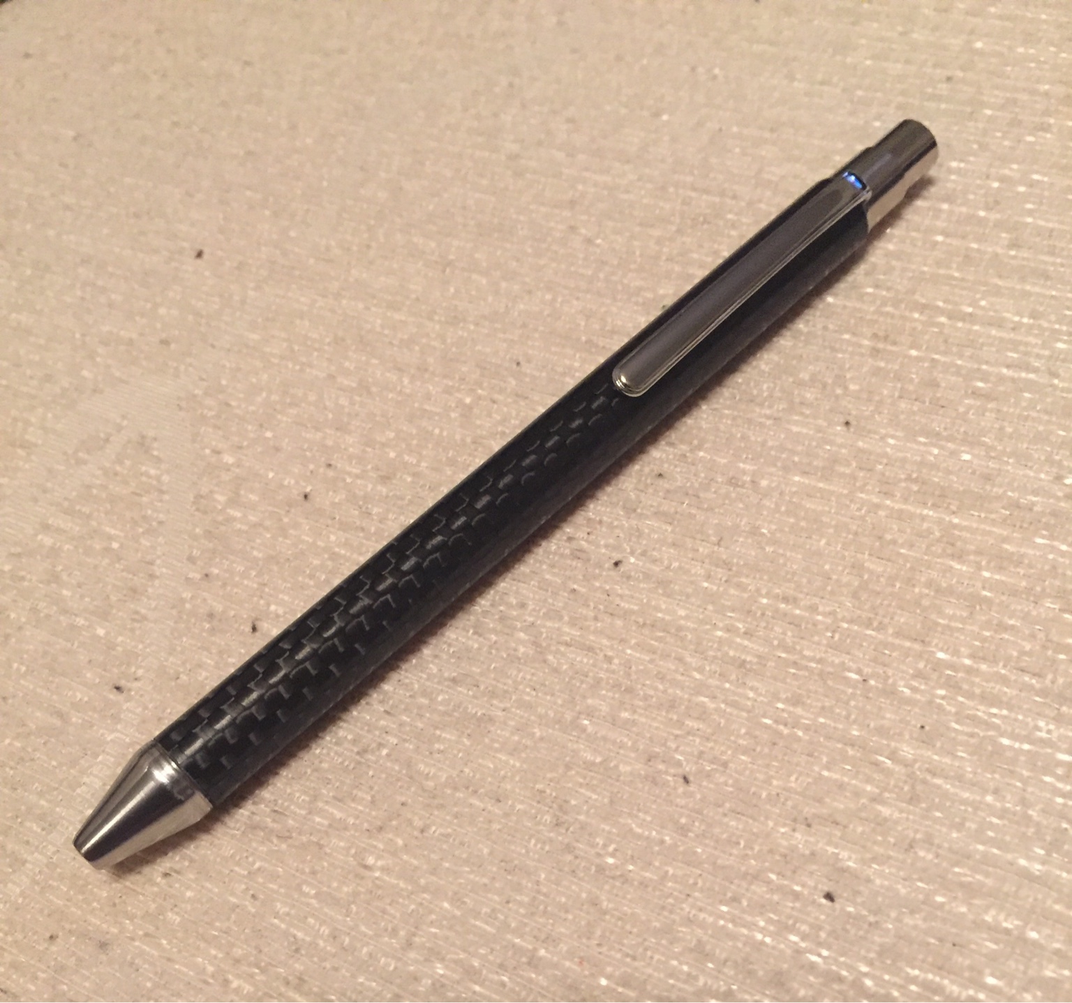 These were my first tries at kitless clickers. The body is made from carbon fiber tubes, 10mm OD by 9mm ID. The click mechanism is Schmidt's SKM 88 and the clip is from a PSI Seam Ripper kit. It's designed to use the Pilot G2 gel rollerball refill.