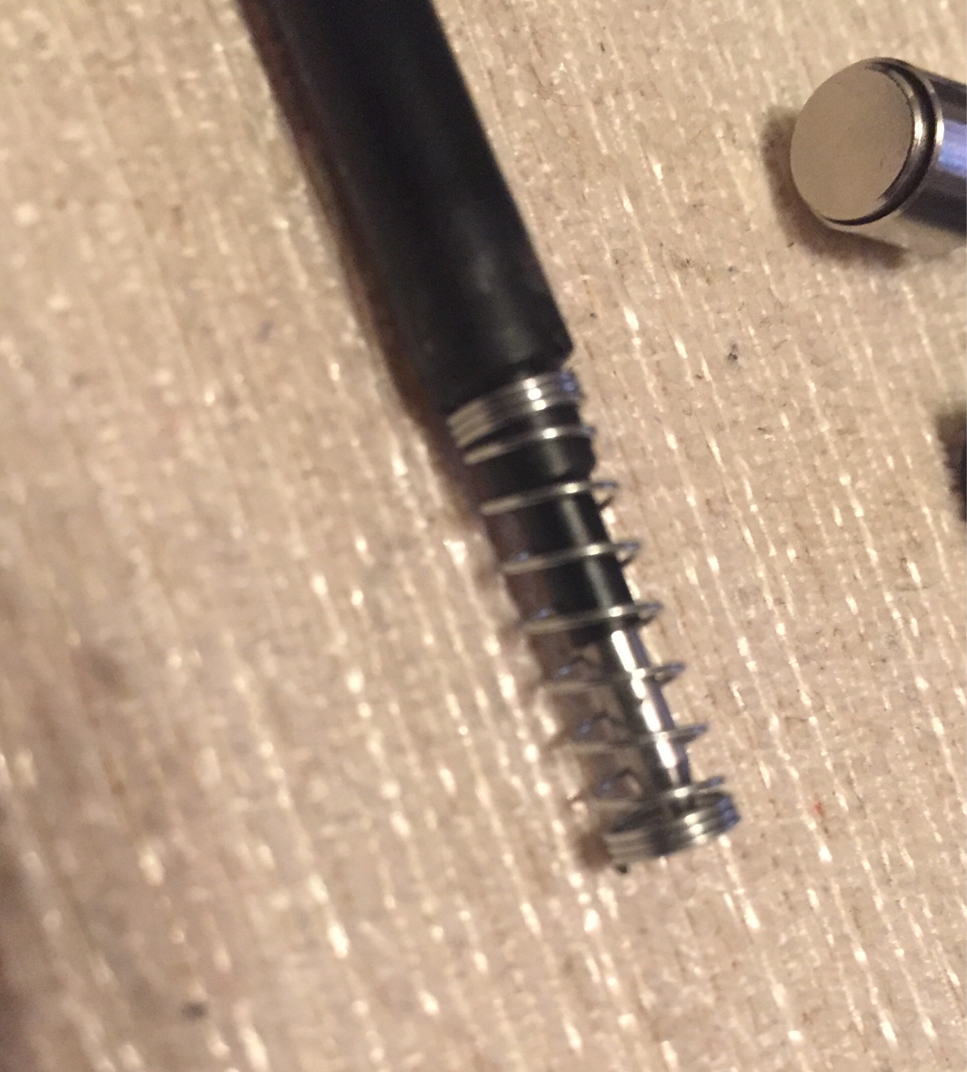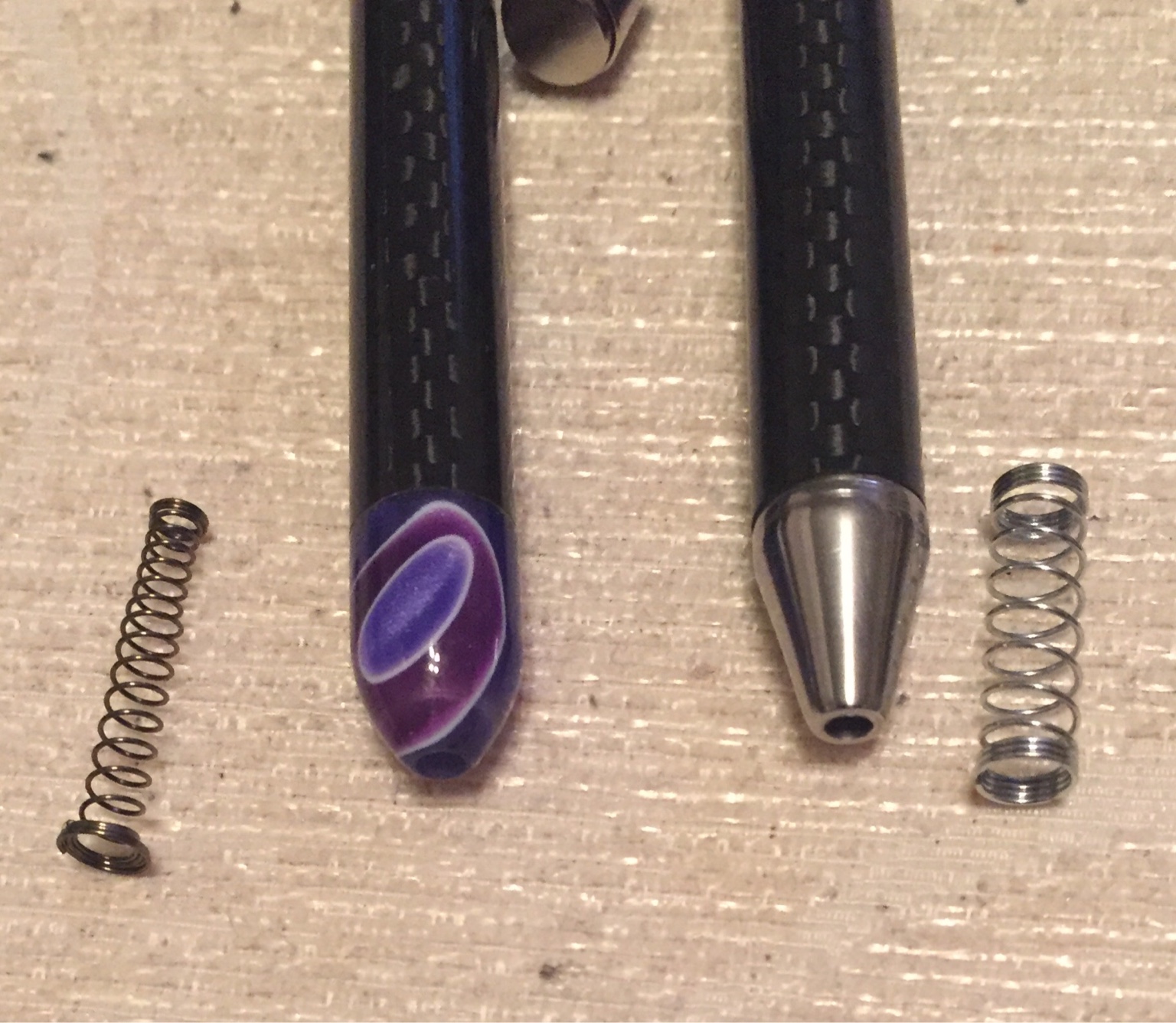 The biggest challenge was working out the front nib section. The purple tip was done first using a spring I got from Milan Pens. The spring sits on the front of the refill pushing the hole further into the tip. This limits the taper of the tip leaving an odd profile I wasn't crazy about. For the next pen with a 304SS nib, I used a spring from a Pilot G2 pen. It's larger diameter sits further back on the refill allowing the the tip to have a narrower taper that looks more like a normal pen.