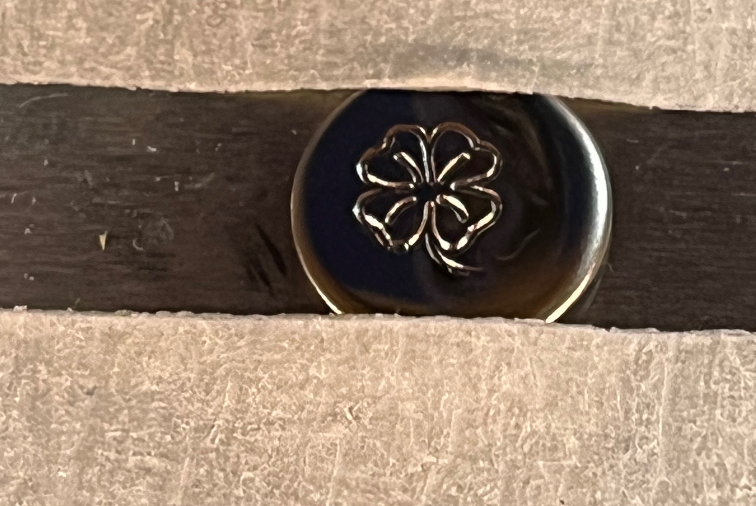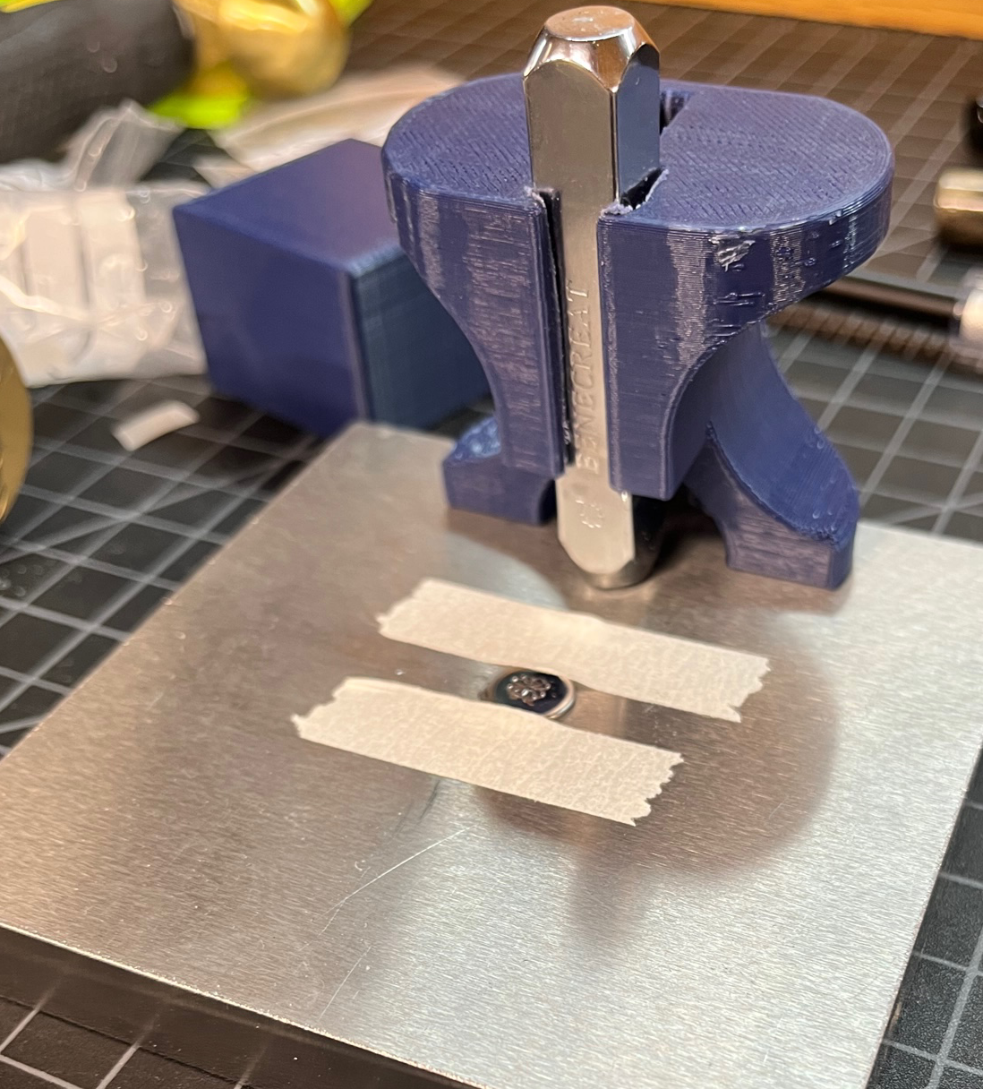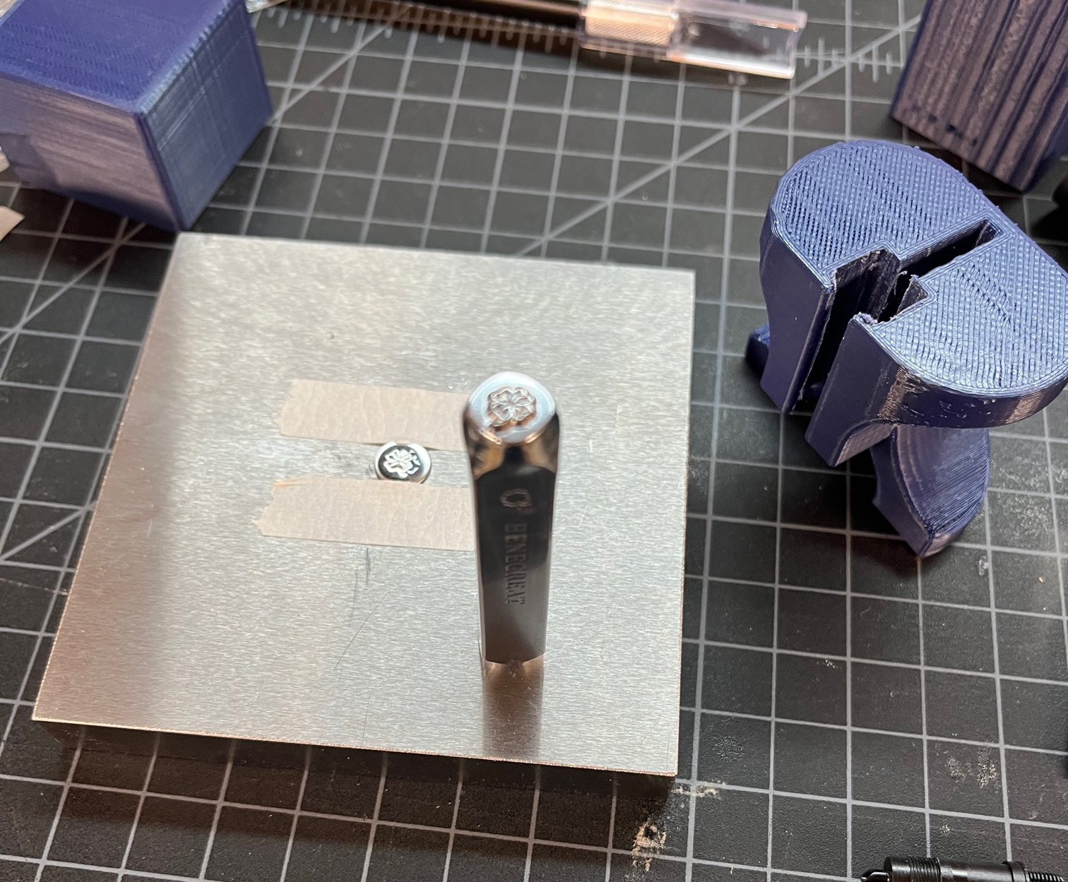 I have been trying some metal stamps that I got on Amazon. There are all kinds of graphics available, or custom stamps. I am getting mixed results. I made a jig on my 3d printer to hold the die in place to make sure when I hit the die with a 2lb brass hammer that I get an even stamping. The problem I have now is centering my stamps every time. As you can see below, I have not mastered that yet. This is a clover. I am working on jig v2.0 which will give me a way to quickly center.