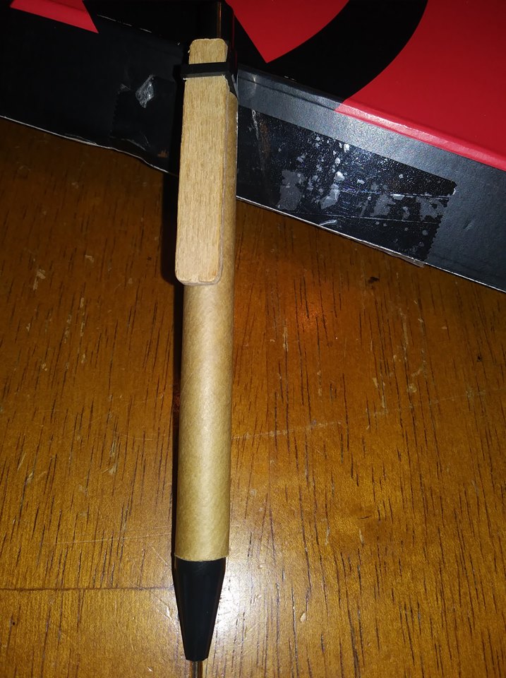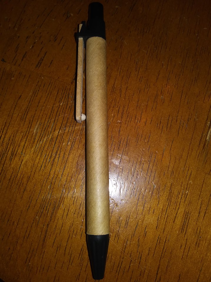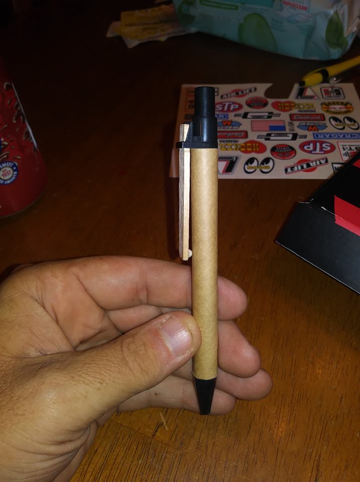 Well, I was challenged to make a pen without using a lathe. So I used popsicle sticks, toilet paper roll, and a cheap bic click. I did this in my office and not in the shop. I think it came out pretty good