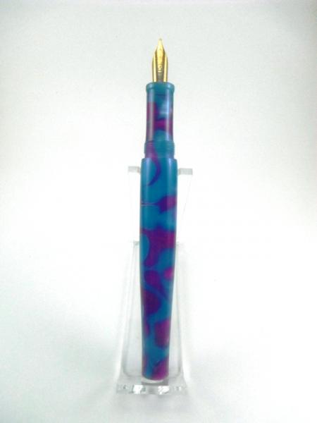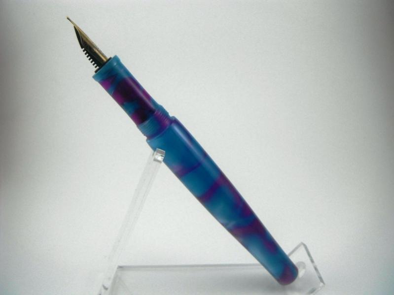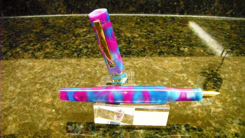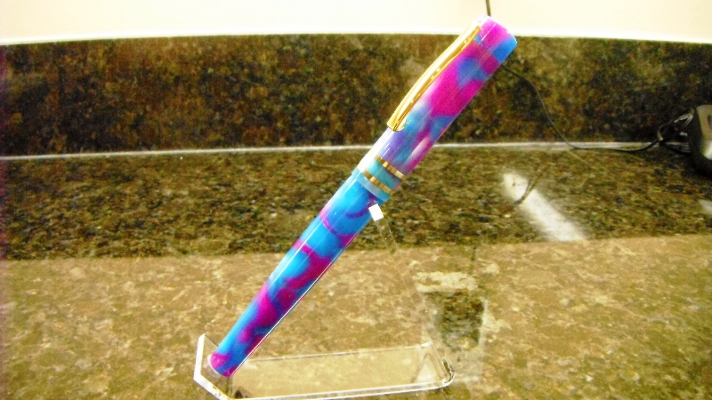 I made the body and section a while ago and put it aside. My daughter saw it, claimed it, and asked me to make a cap for it. So I decided that it was a good time to try a cap with bands. So I went off to the hardware store and bought some brass washers. I read over the tutorial by Charles Hutchings and off I went. The nib is a small tubular 6.1 mm Schmidt with a medium point. I am not a fan of the look of these nibs but I bought a bunch of them to practice with. However, they do write well. The blank is an acrylic acetate called purple rain.