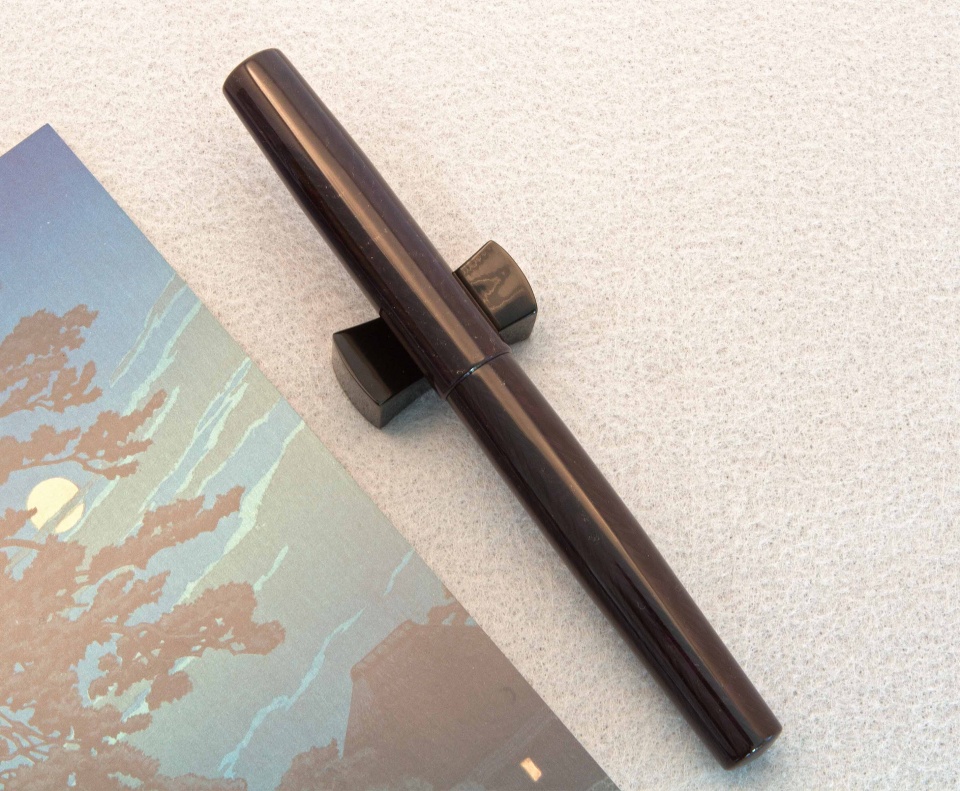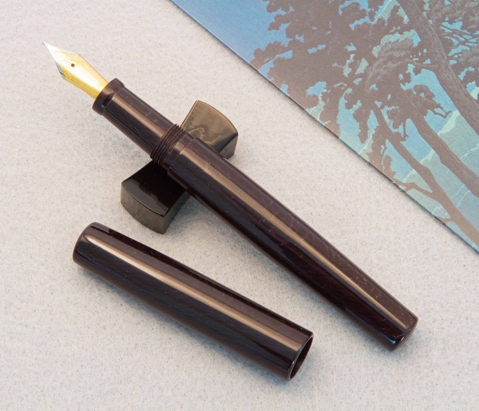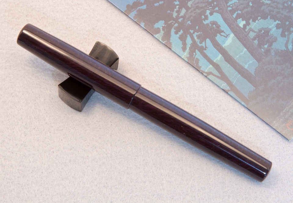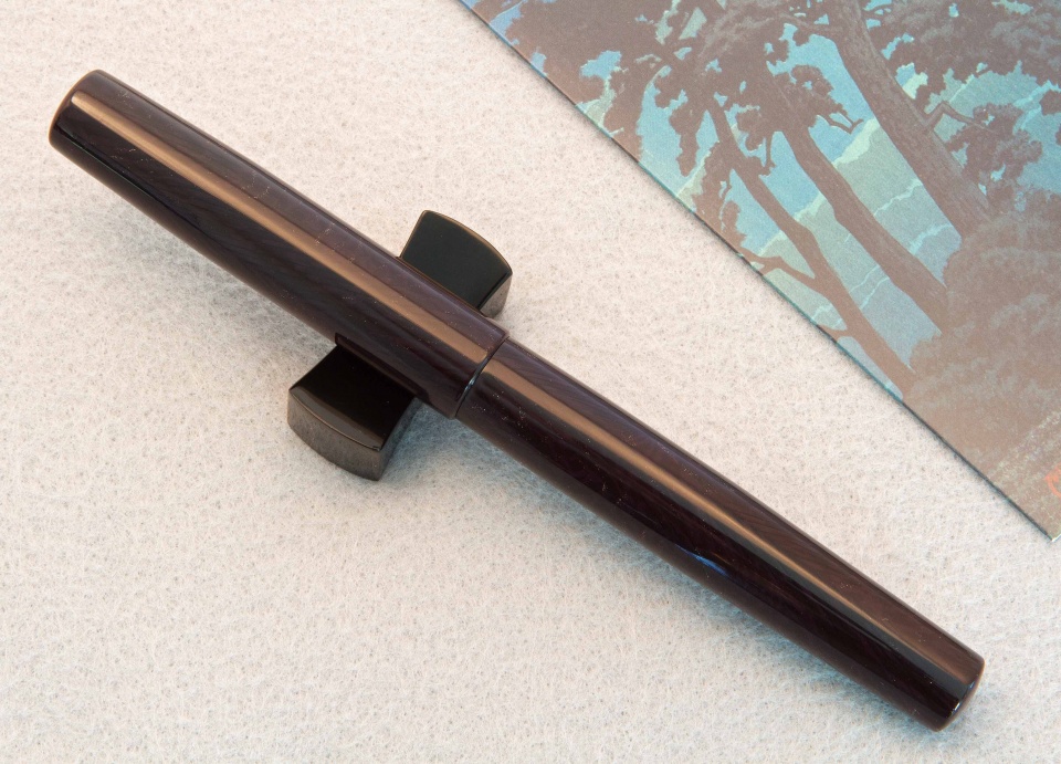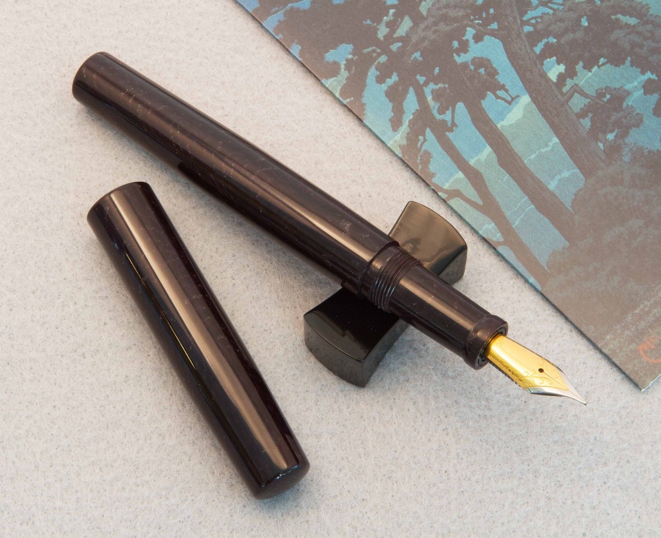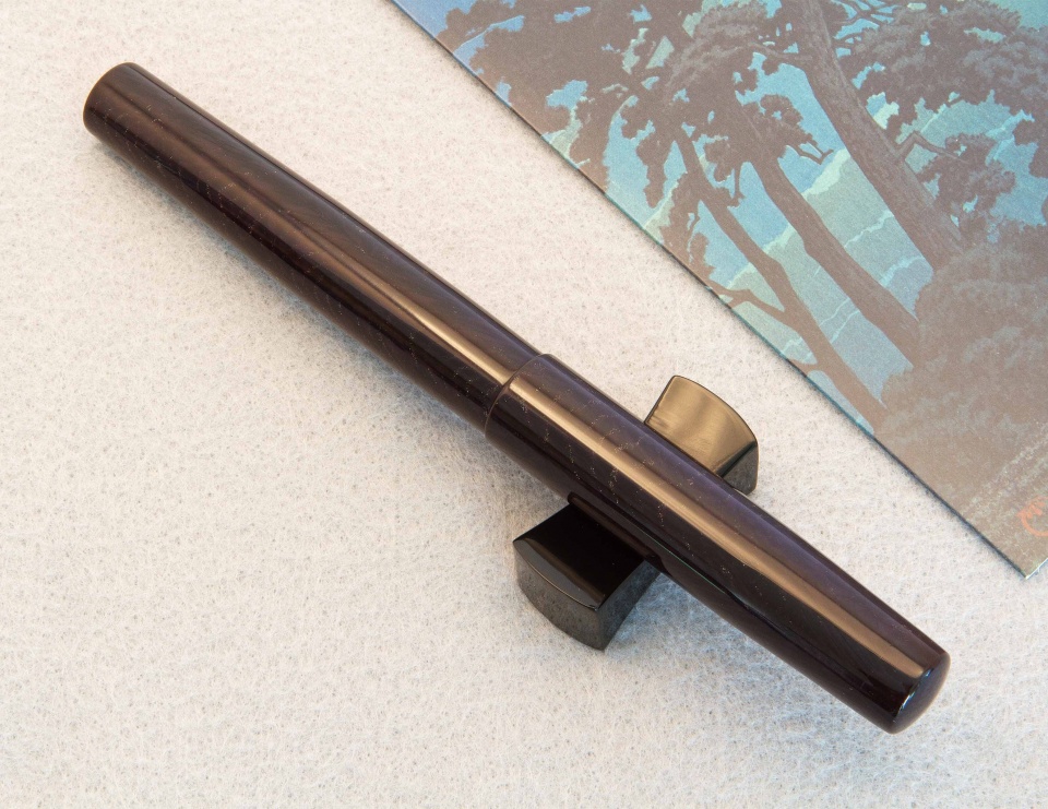 Everyone has a favorite form factor in fountain pens, mine happen to be along the lines of some of the classic fountain pen shapes of Nakaya and Pilot Namiki. As homage to their art, I produced this pen in purple web celluloid. I tinkered with the notion of a clip on the pen, even installing the clip, but abandoned the idea when I had no clips I thought up to the task of fitting the conservative lines of the pen. If anyone has any suggestions for custom clips or where to get them made without buying a truck load please let me know.
