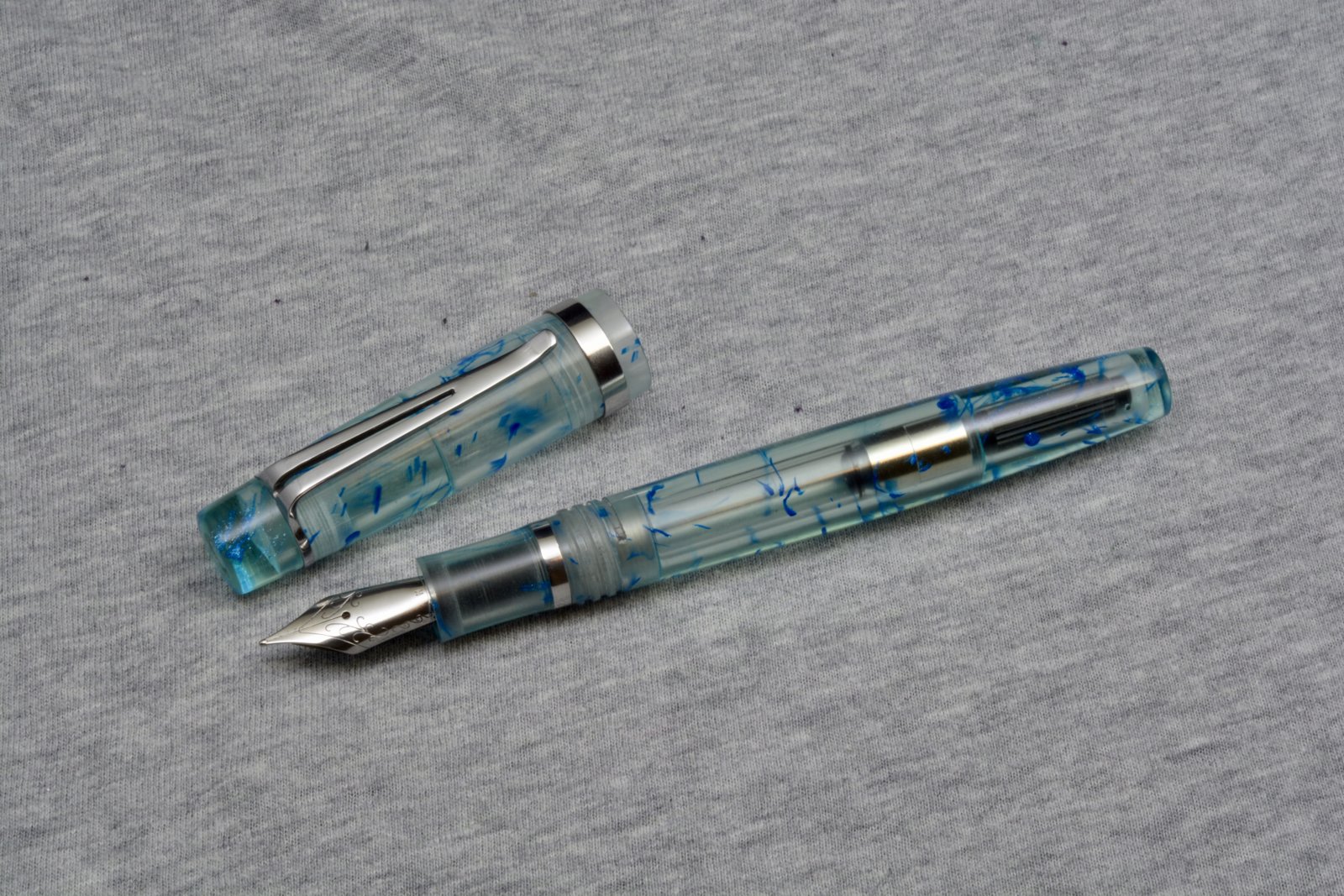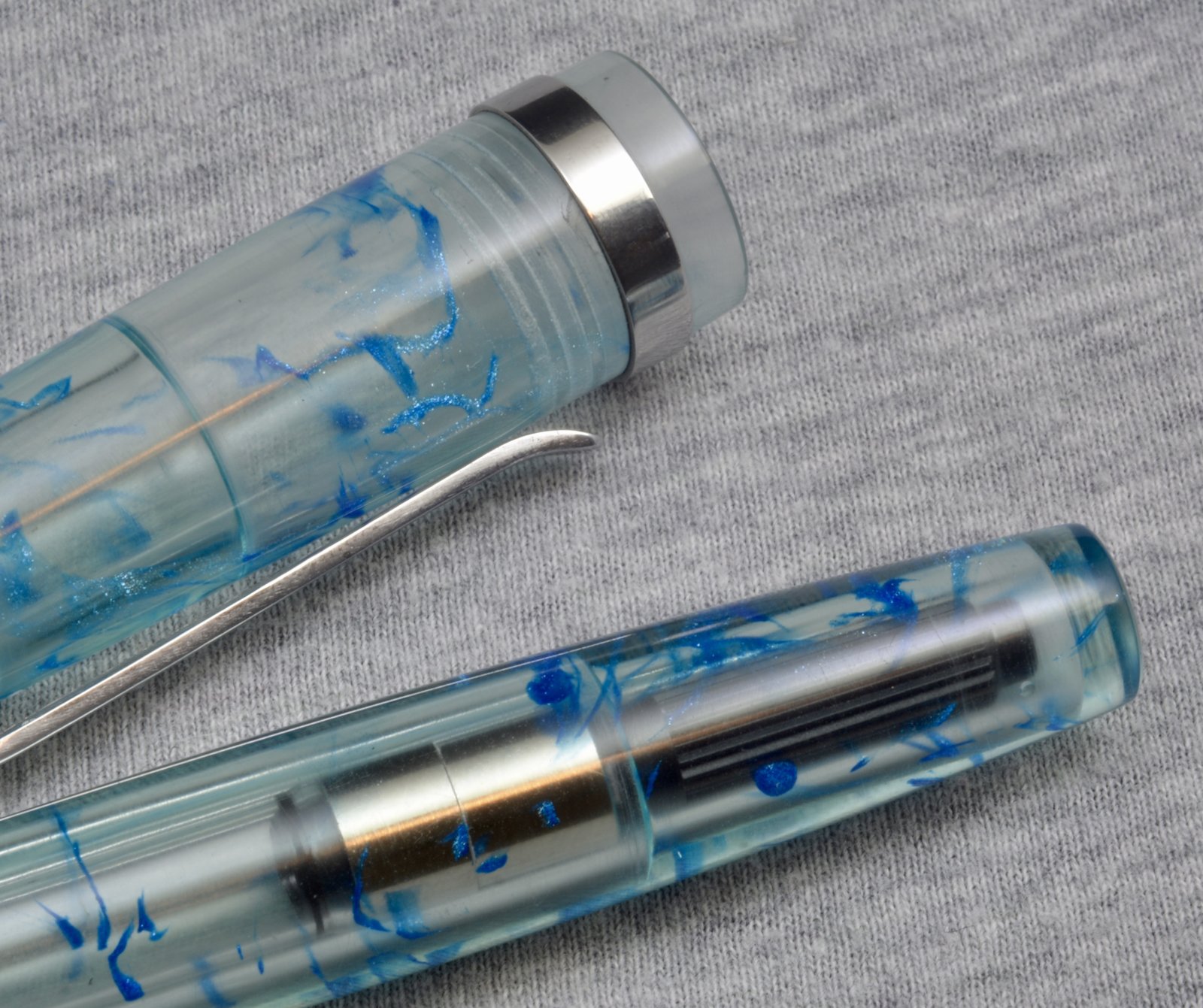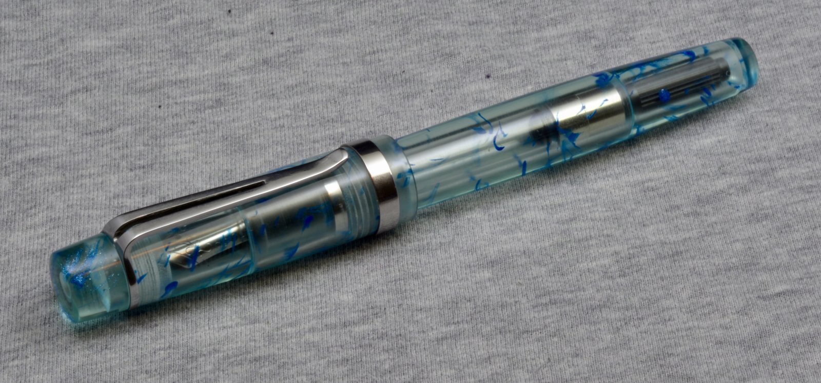 Since demonstrator (transparent) pens are super popular with the fountain pen crowd I run with, I often pour a lot of transparent blanks. This is one I did a while back, but hadn't gotten around to using. It's a teal matrix, with swirls of metallic blue resin dispersed throughout. I made the clip and trim from stainless steel, and the nib is a jowo #6. It's around 5.25" long when capped, and posts for those who have large hands.