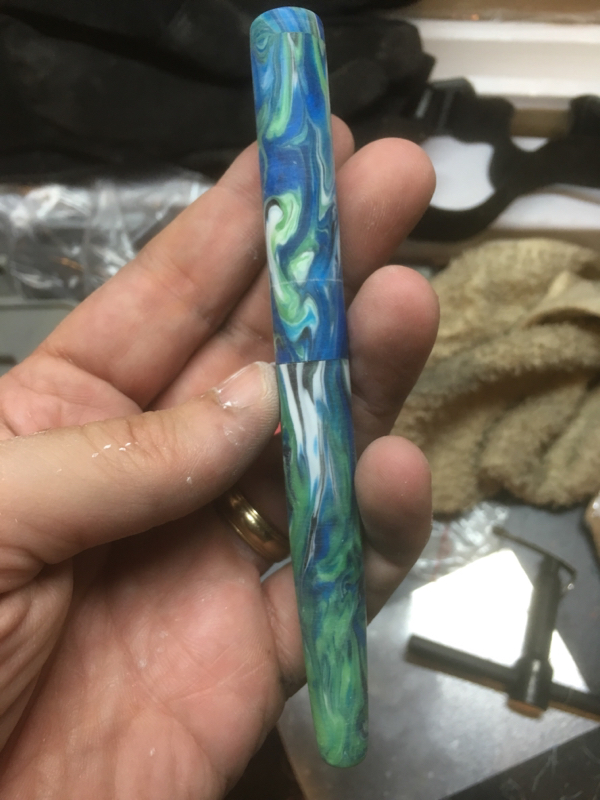 I haven't turned anything in quite a while. I got a little shop time this weekend. I started this one yesterday and hoped to finish it today but it's just not going to happen. The blanks are polyresin and a bit brittle. First I broke the thread section of the barrel. No problem, I left some extra length so I was able to part the threads off and make new threads. I then snapped the threaded portion of the section when I was trying to shape it. I might have to make a section out of white alumilite.