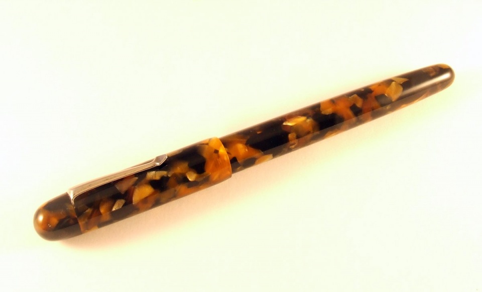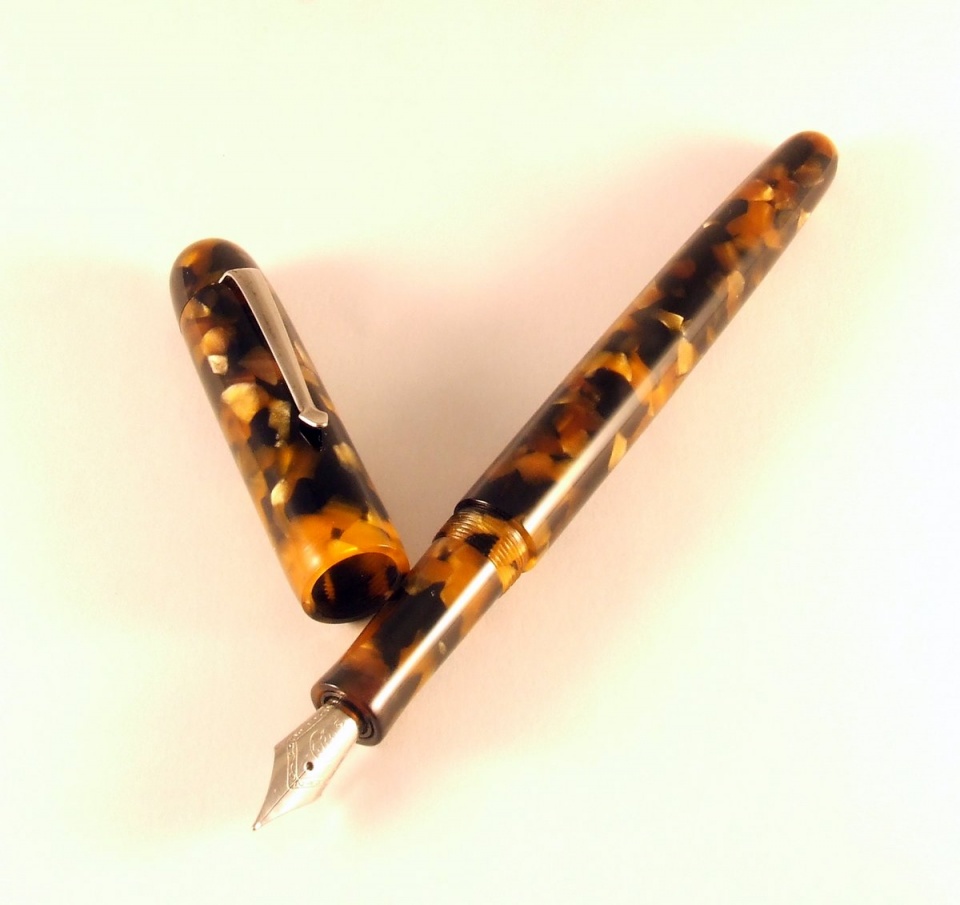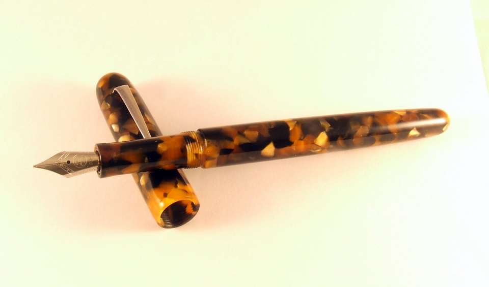 It has a steel Bock number 5 medium nib. The material is an acrylic called "iced cube crush honey". Length capped about 6inches, uncapped about 5.5 inches. 12mm single start cap thread and 9mm section thread.