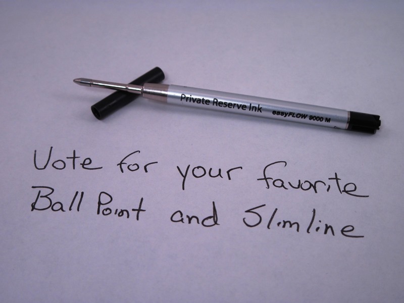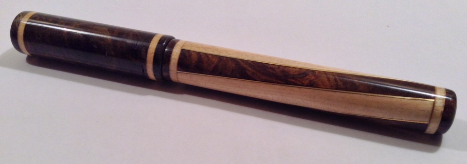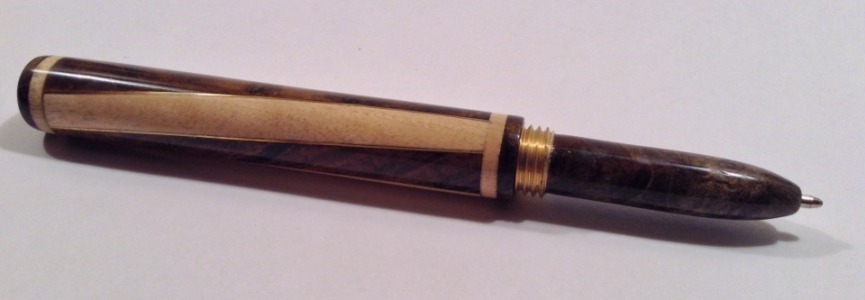 This is my entry into the kitless contest. I used a commercial refill, but everything else you see was made by me. It's a minimalist design inspired by Frank Lloyd Wright, Waldo (from Where's Waldo) and a mime (I asked but he wouldn't give me his name). It is smaller than most pens, very sleek and has a pressure fit postable cap. The first photo shows the pen with the cap on. The second shows the pen with the cap off and as you can see in the third photo it writes beautifully. Measurements are 9.8 cm long and .6 cm wide with a weight of 3 grams. Oh and it takes a Parker refill. For my first attempt at a kitless pen I"m very pleased.