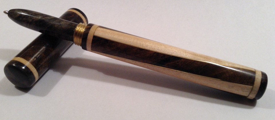 The cap and barrel were turned from polyester resin. The 3 trim bands are black alumilite. The section is matte black ebonite. The nib is a 6mm 1.5 mm Italic Jowo. It will accept cartridge/convertor or eyedropper fill.