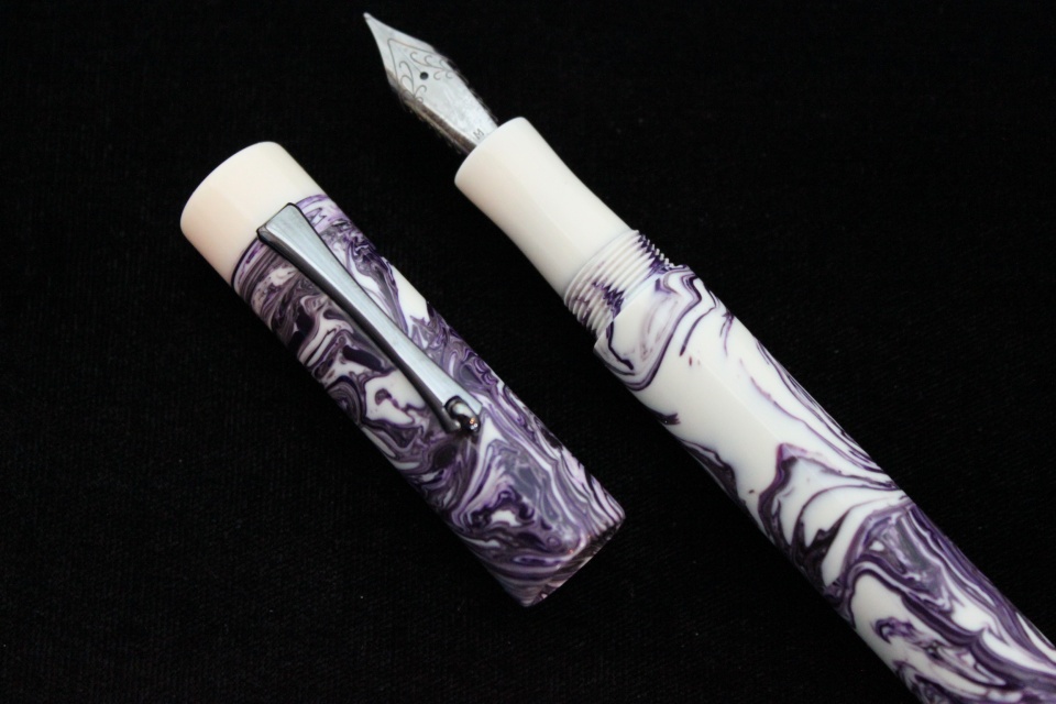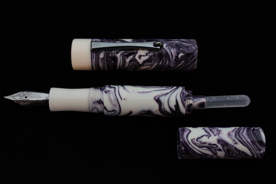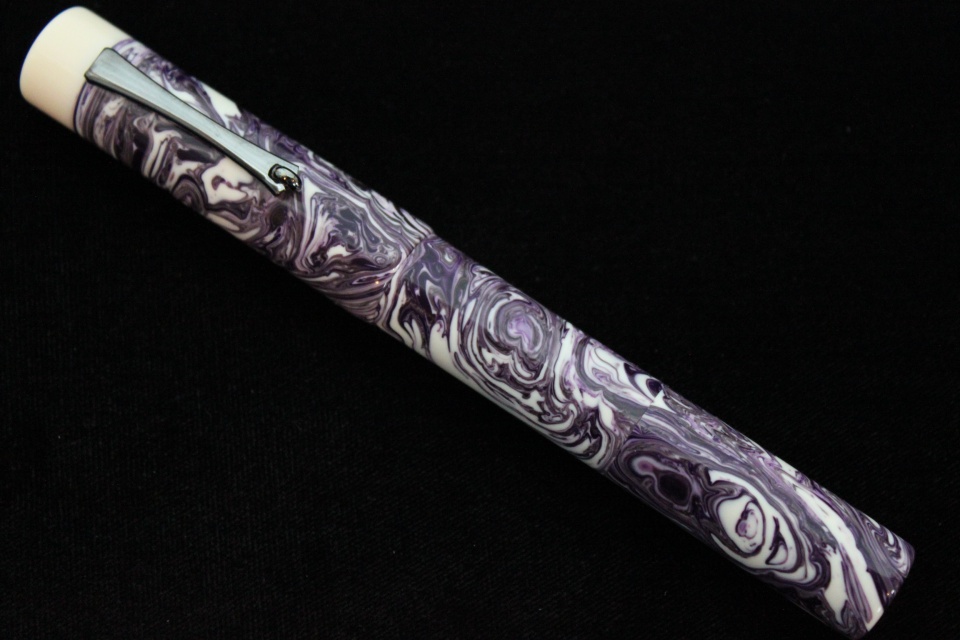 Its a bulb filler with a ruthenium nib and black titanium clip. I used an alumilite blank with faux ivory accents.