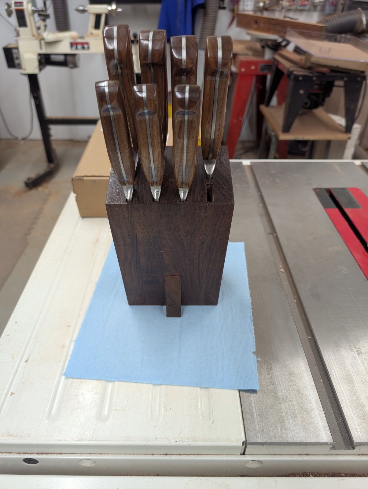 Back in late December I posted on this site some Chefs knives I'd made for my wife some time back. Well the knives are finished and I needed a place to store them. So...I contacted my good friend Chuck, @Dalecamino, and asked him if he'd ever made a knife block. He hadn't but sent a very nice YouTube video of how to make one. The wood for this block is Walnut Crotch (Black Walnut and English Walnut graft site) that I got from a guy in Stockton CA. He's since passed but I had one more nice piece that I could use and have some left over. So here it is. Walnut knife block with knives (the handles are also English Walnut) The finish is Teak Oil with WOP as the top coating. Now on to Steak knives for her. She has them all picked out for me.