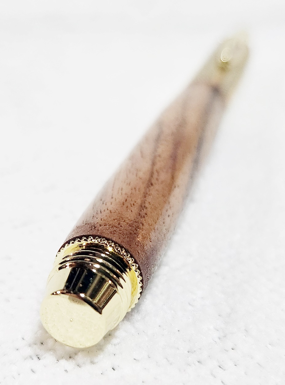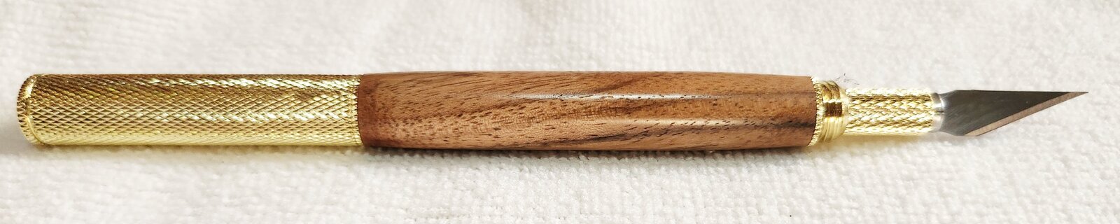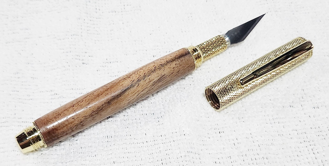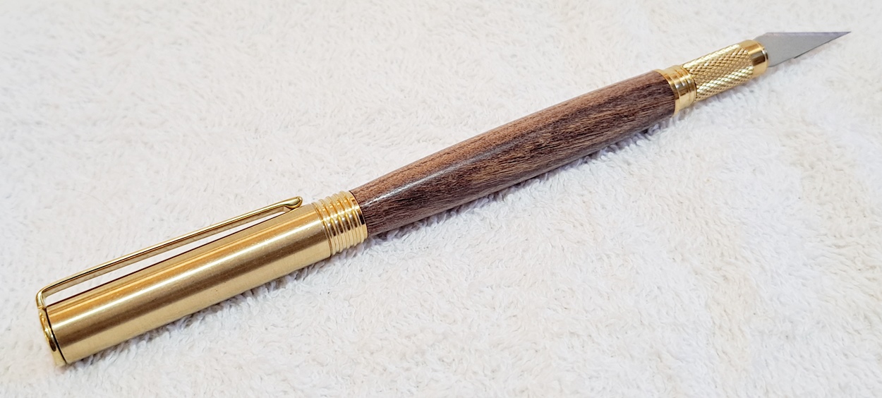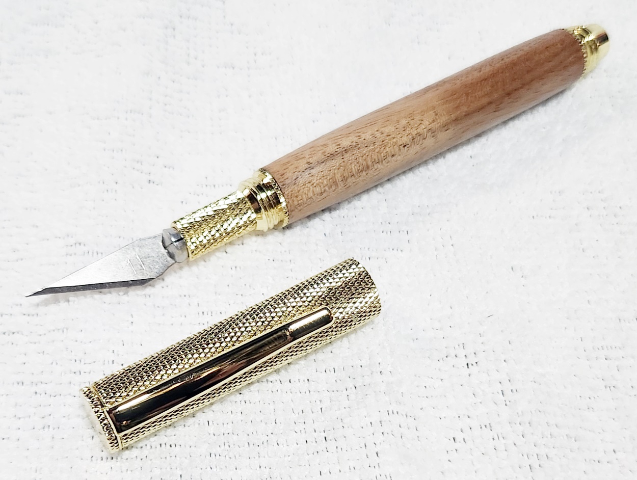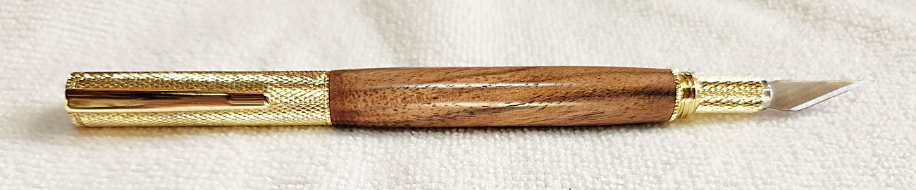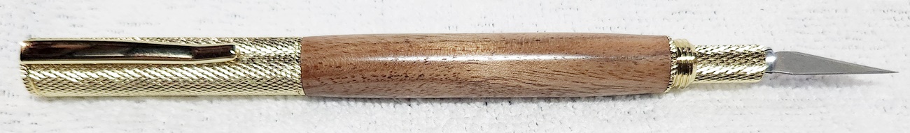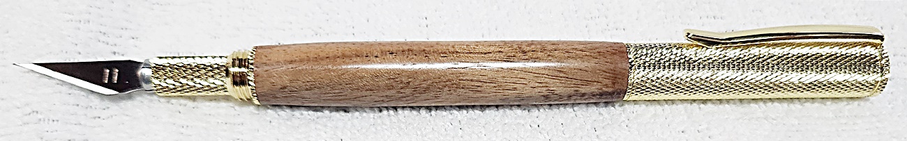 This is a Hobby Knife in gold from Woodturningz. The wood is English walnut. The finish is Pens Plus.