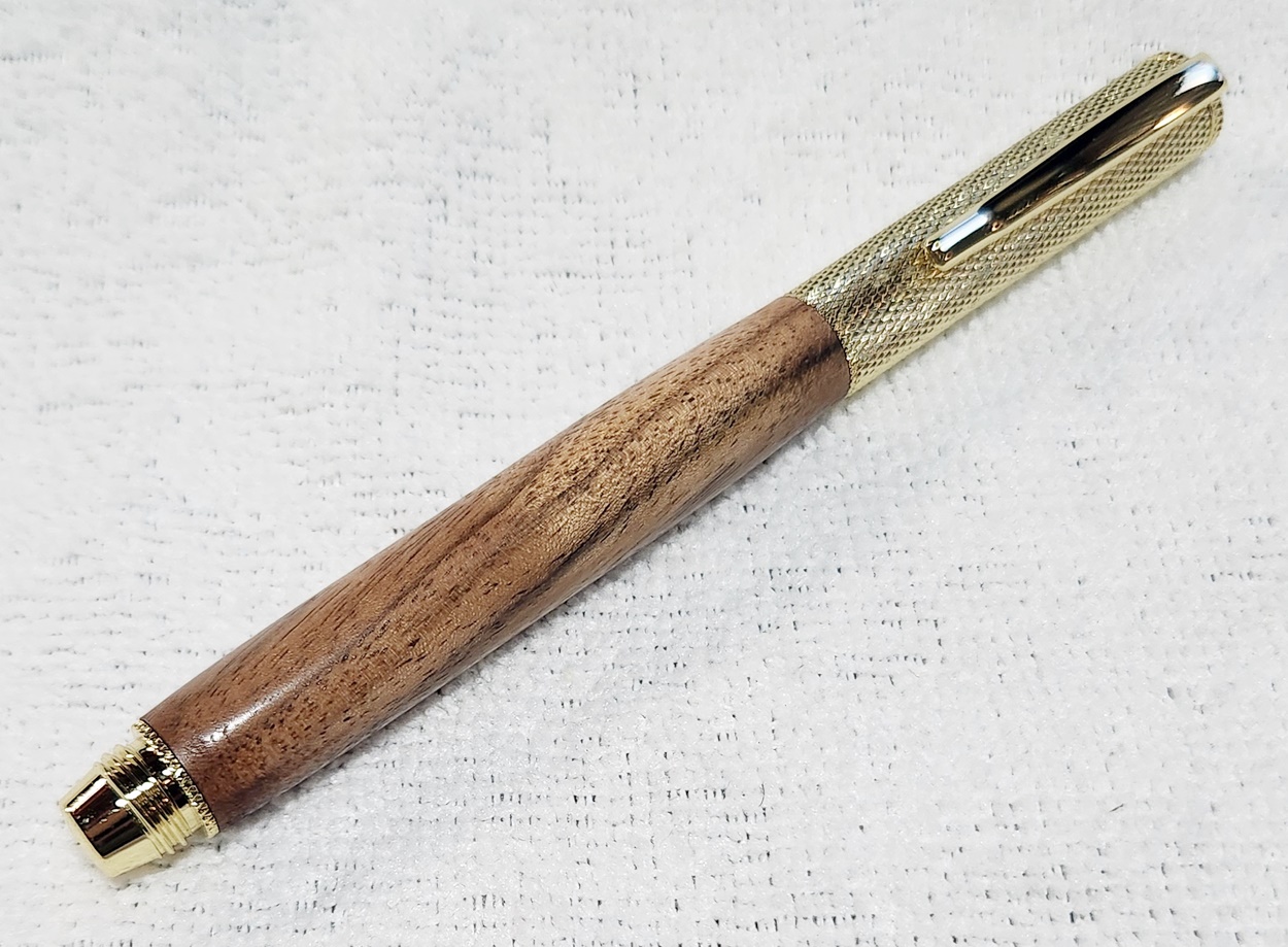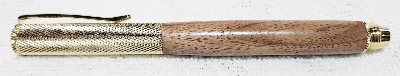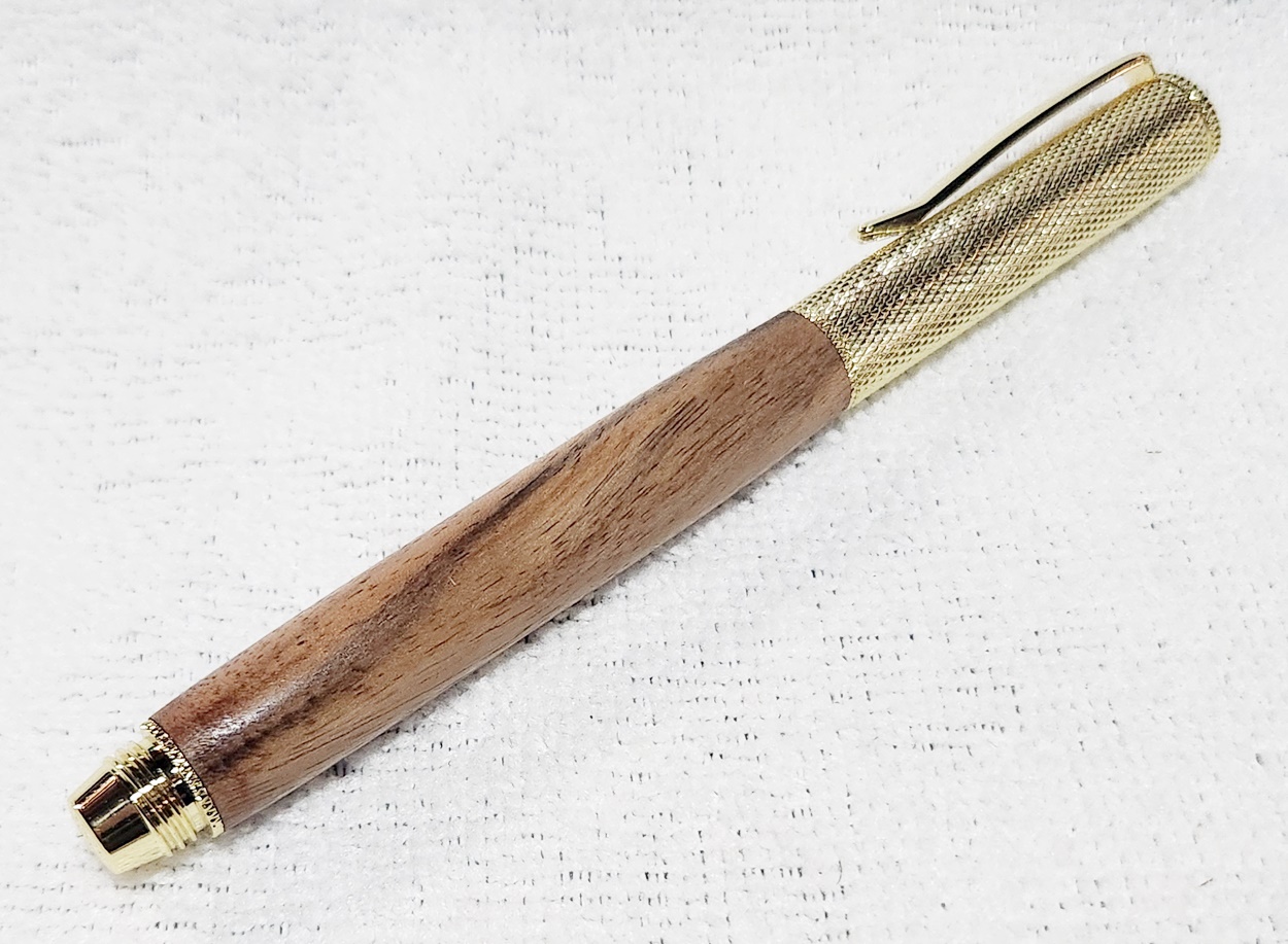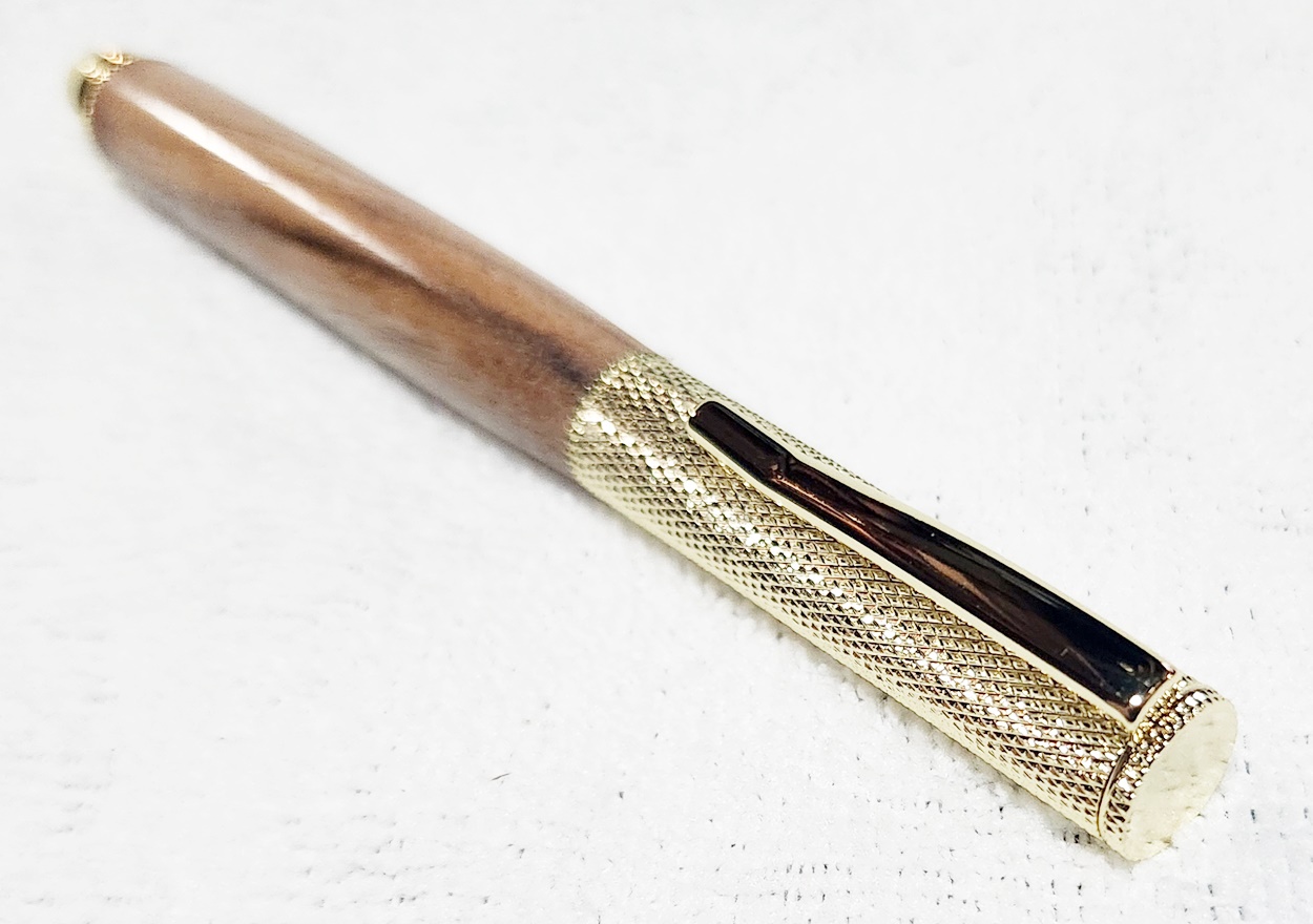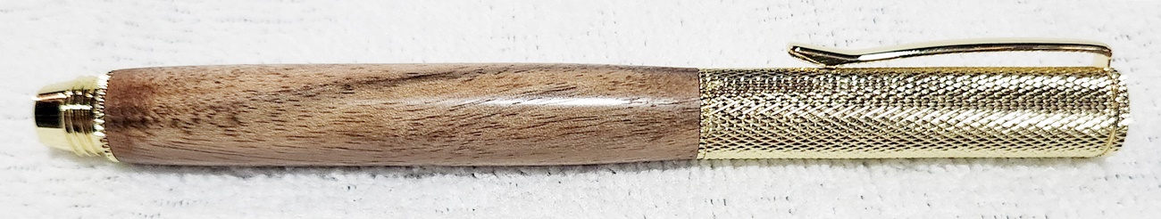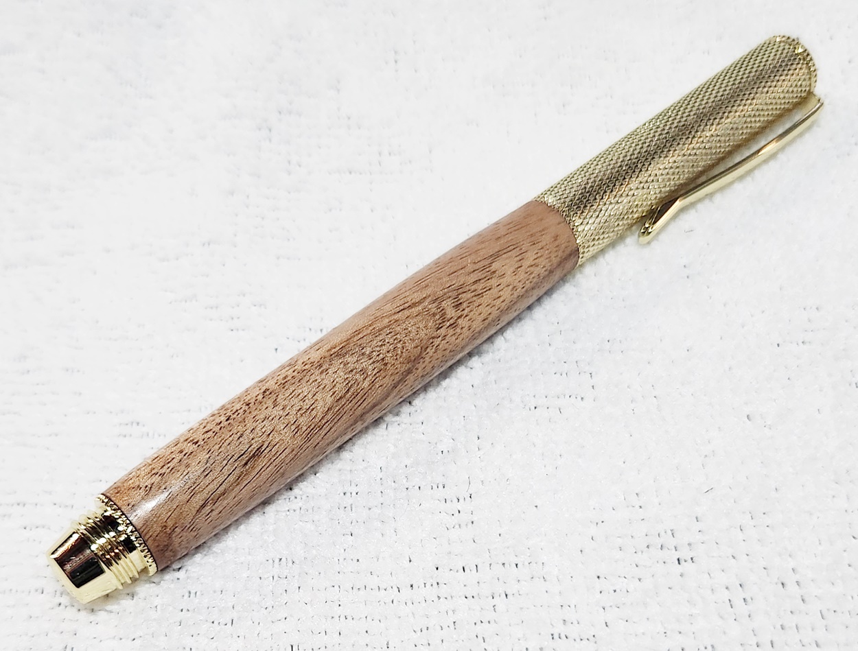 This is a Hobby Knife in gold from Woodturningz. The wood is English walnut. The finish is Pens Plus.