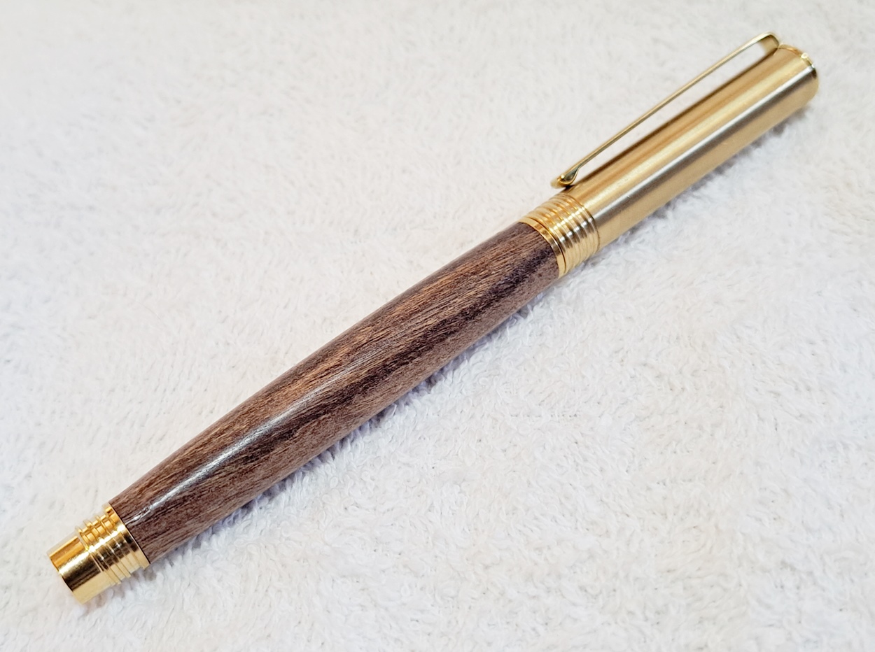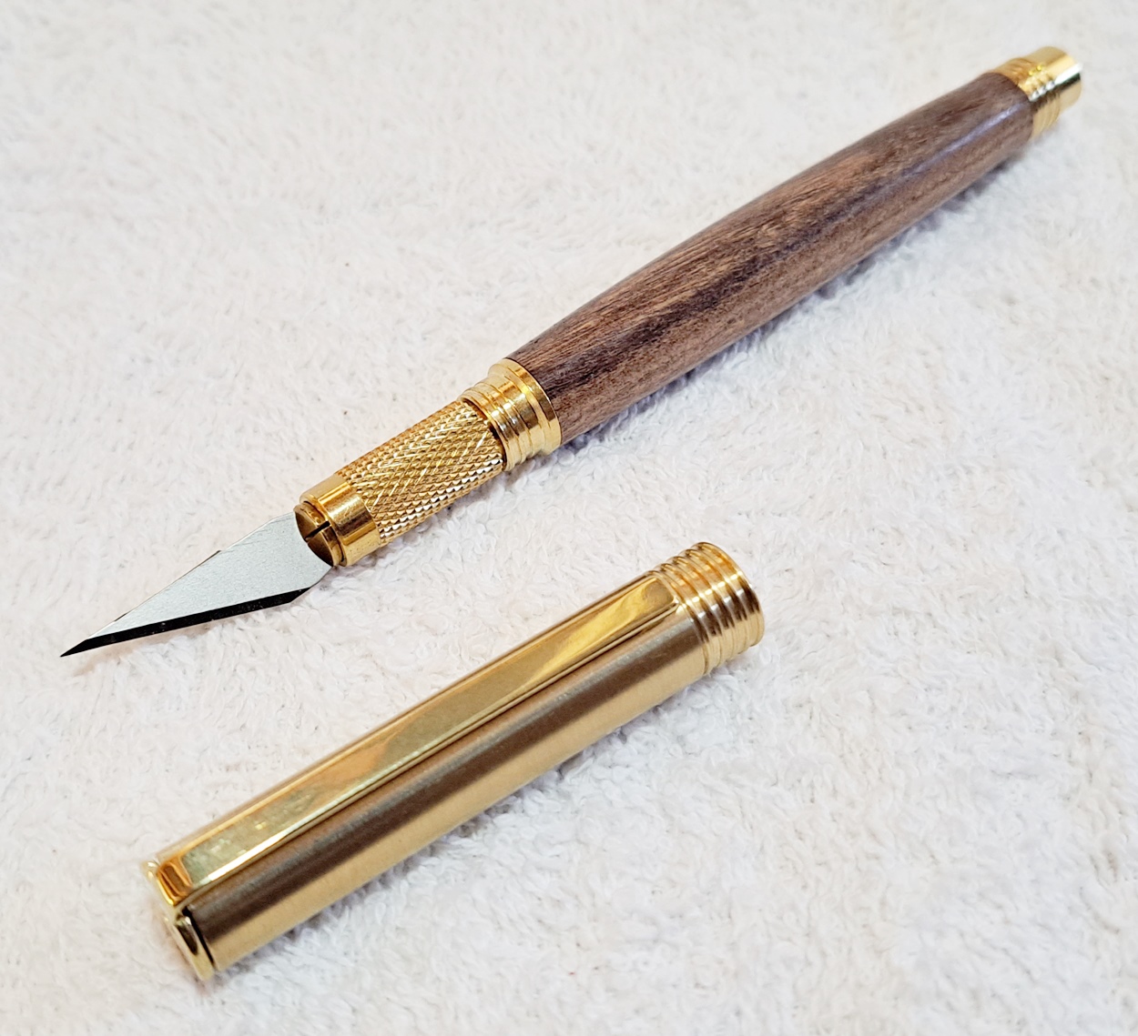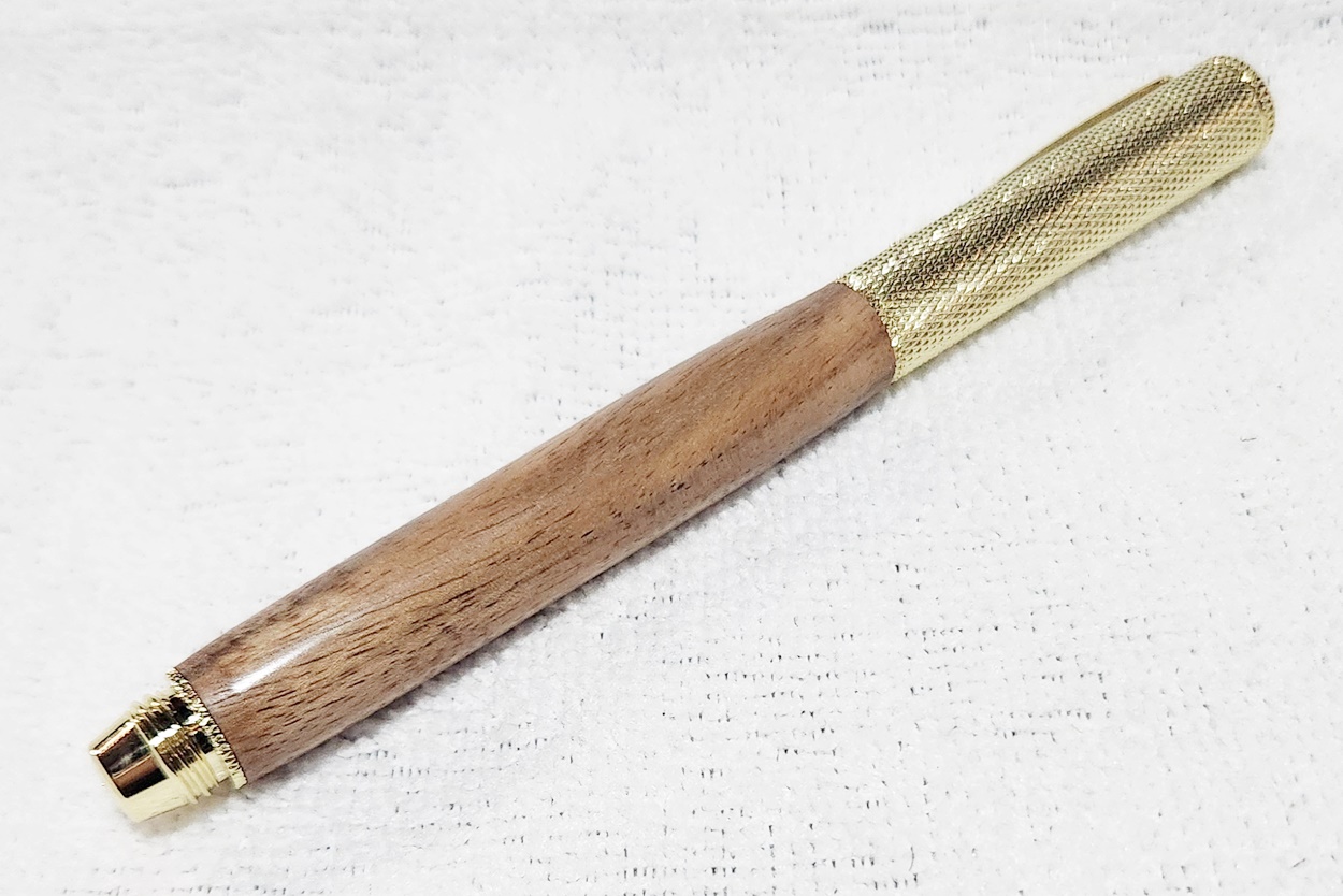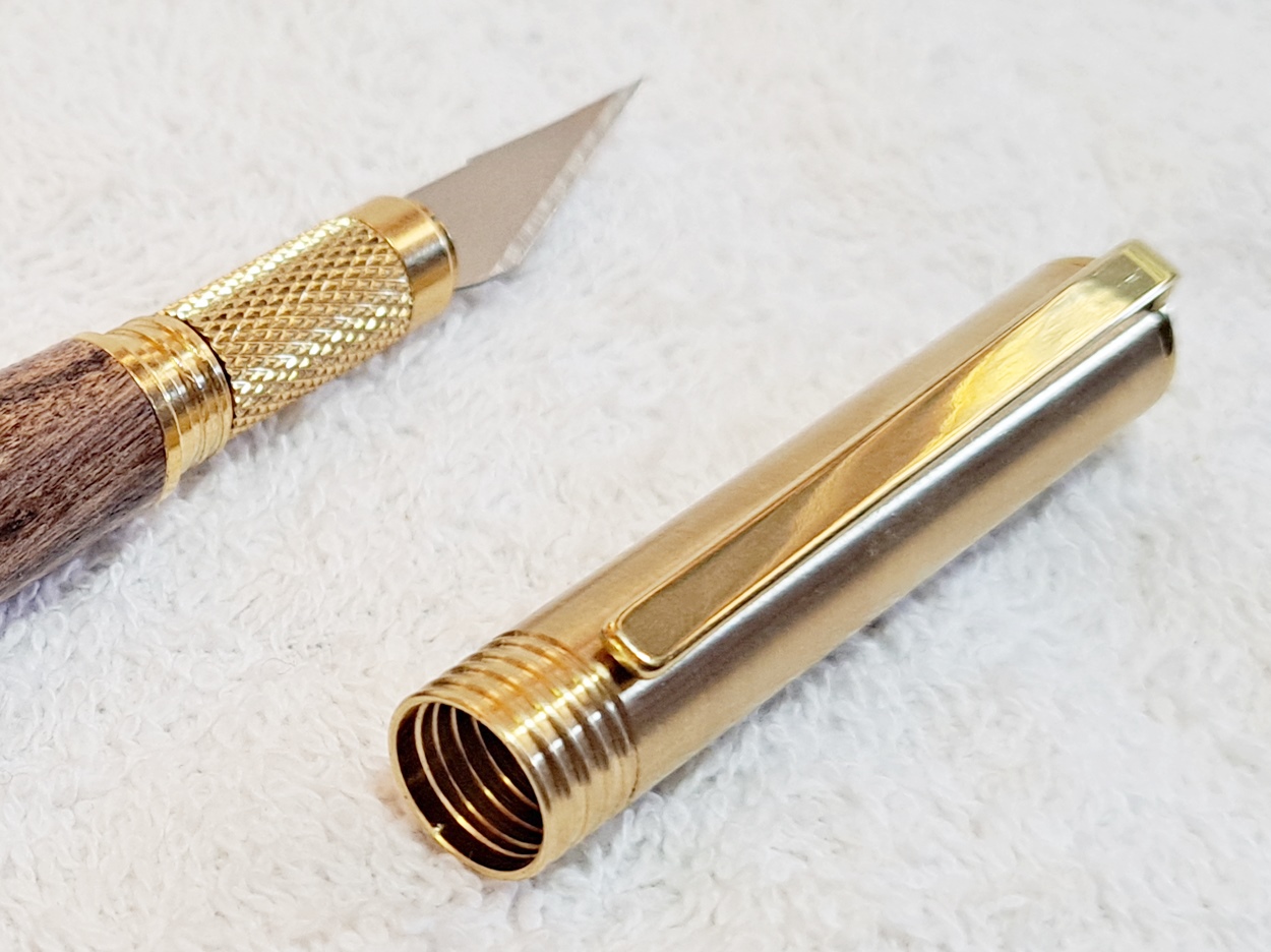This is a Hobby Knife in gold from Woodturningz. The wood is English walnut. The finish is Pens Plus.