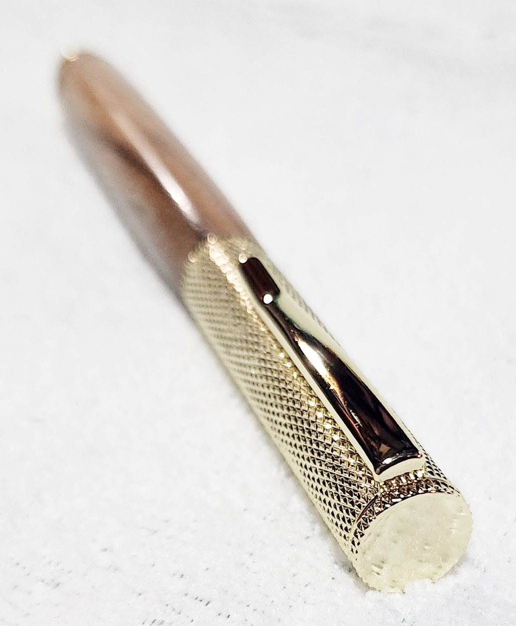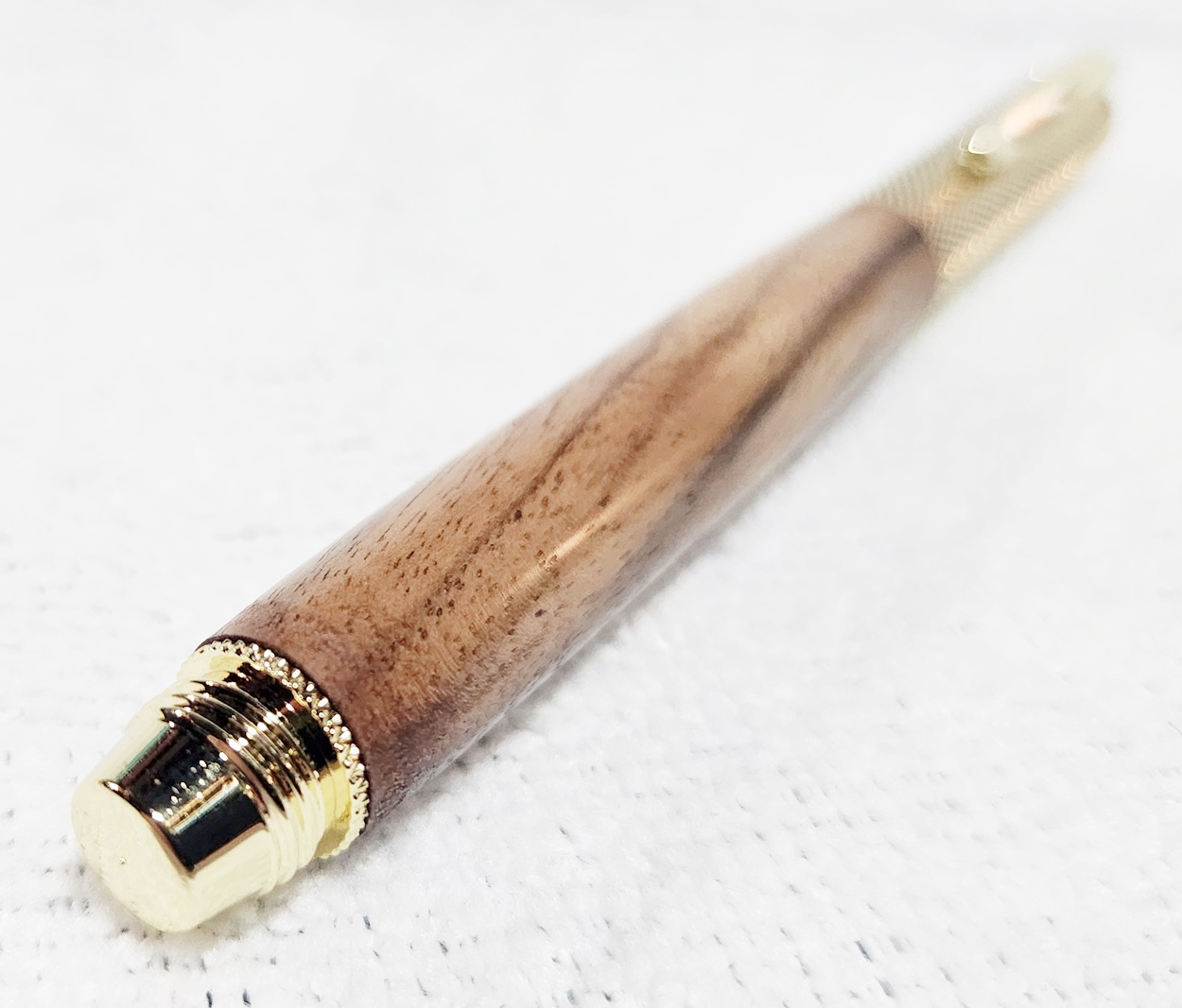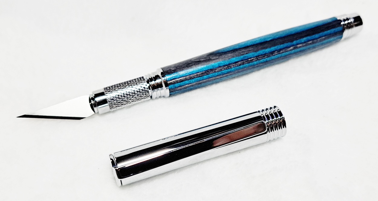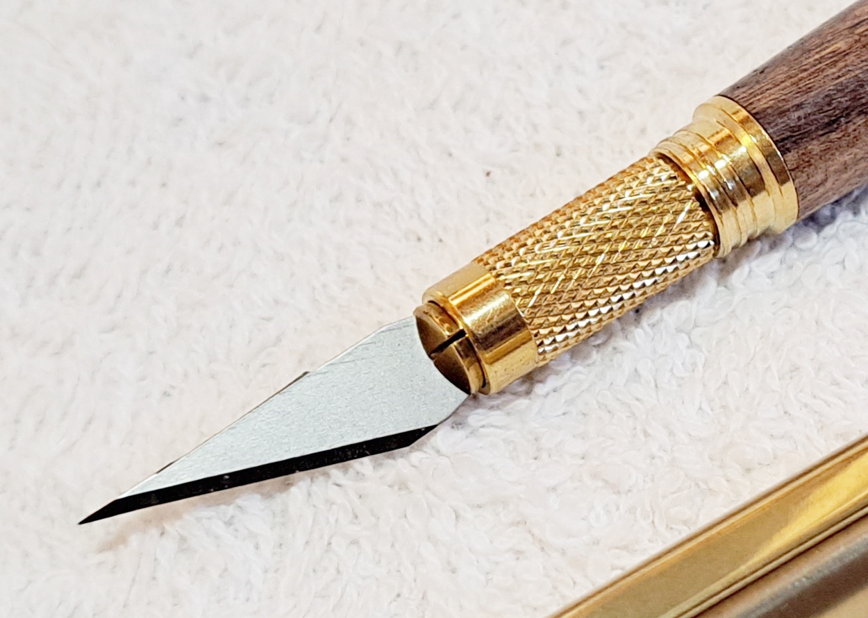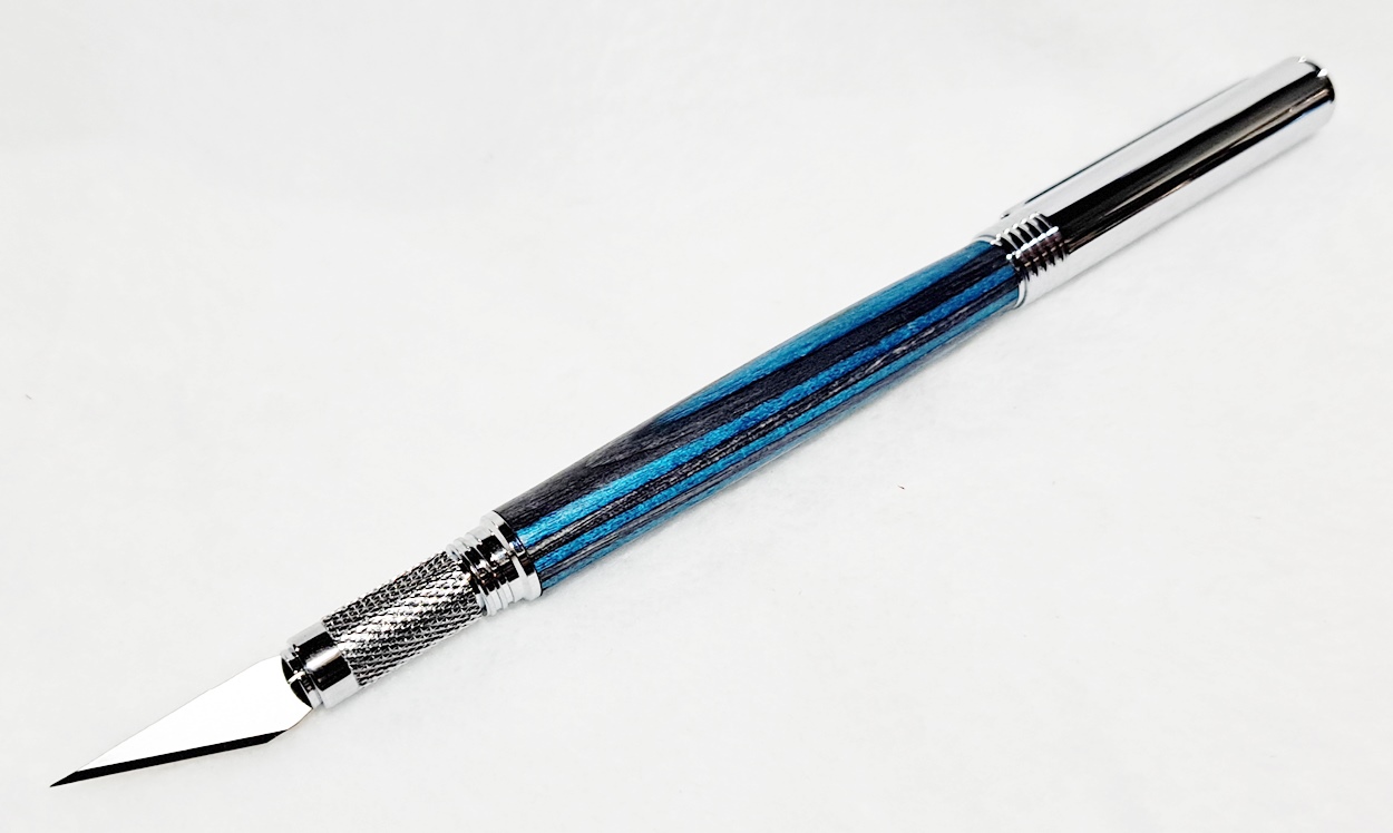 This is a Hobby Knife in gold from Woodturningz. The wood is English walnut. The finish is Pens Plus.