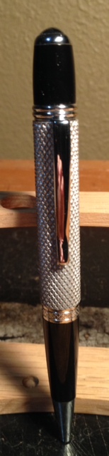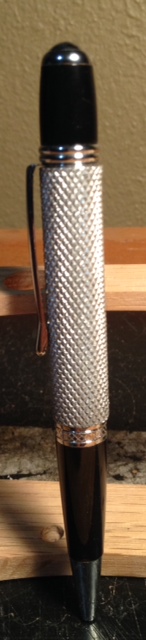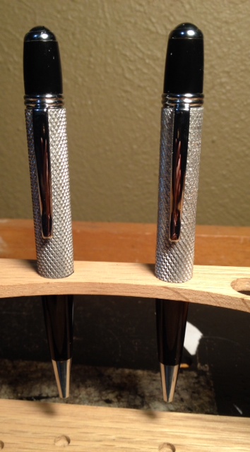 This is a pair of knurled aluminum body pens I made. These will be a gift to my machining instructor and the lab assistant at the end of the semister. The pen guts are a wallstreet 2 pen. The pen body is 6061 aluminum with the hold drilled to 25/64" which eliminates the need for a tube.