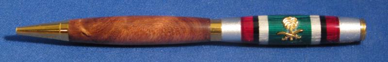 This is a ribbon awarded to Marines that served in the Kuwait freedom campaign. I found it in a to do box that was in the shop. I know this was a favorite ribbon of my brothers and decided to make the pen with some Mesquite burl that I picked up while attending his funeral service. I plan to give it to his son when he returns from Iraq after his current tour is up. I want to thank Jim Walter for making this blank (I found your card with it). You did a great job on it Jim.