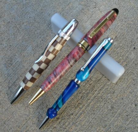 Here's a couple pens from Eugene in LA state prison. I read this letter and have to wonder...what's to motivate a person not to go to prison??? He has a full time job working for some humanitarian outfit where he makes something like $7.50 an hour. Basically half that money goes back into the prison system and he keeps the rest. He has quite a bit of tools, a turncrafter lathe, a 20" dewalt saw and more. The prison has craft shows too, where he can sell items and keep all the money. He purchases supplies from PSI, Berea and CSUSA by sending them a list of whatever he wants and a money order to pay for it. His pens are pretty good too. Not sure the finish on his wood, I'm going to say it's probably a friction polish, but his fit is pretty good and they are not out of round. I kept the red one, probably dyed box elder, and sent the others back. Don't really know if I was to keep one or all or what, so I split the difference. The red one is a bit underturned at the centerband, but he probably doesn't have calipers, or just hasn't reached that level of perfection yet. Pretty interesting anyhow.