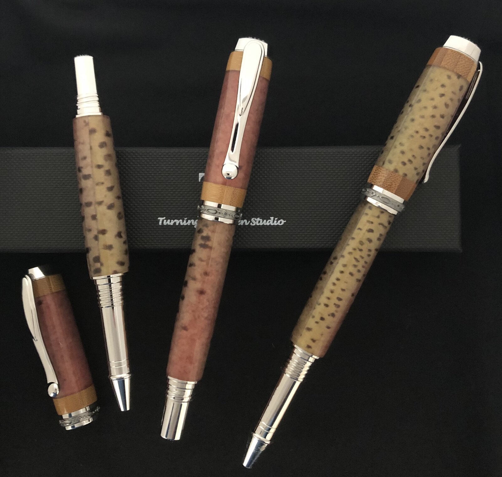 A customer wanted some Trout pens to celebrate 25 years of trout fishing for he and a couple of friends. I label cast a rainbow trout skin. Since many fly fishing rods are made of bamboo I put two bamboo segments on each end of the cap. Dressed them up with Jr Statesman with Rhodium and Black Titanium. C&C welcome!