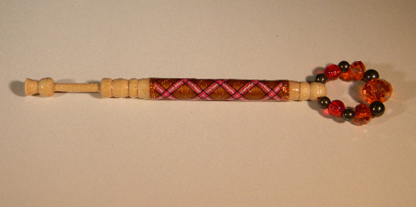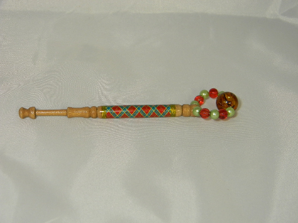 These are lace bobbins I turned from maple and cherry. The design on the handle is wrapped with thread, much the same way a fishing rod is wrapped for decoration. The finish over the threads is a coat of epoxy applied after wrapping the threads. It has been put on a low speed spinner to make the epoxy coating cure evenly, then micromeshed to 15000. Following this, the entire bobbin was given two coats of polyurethane, buffed and waxed.