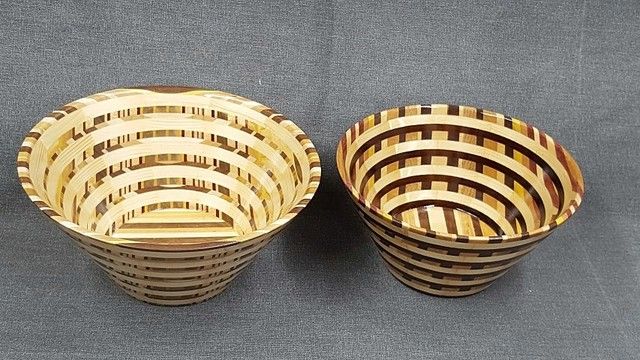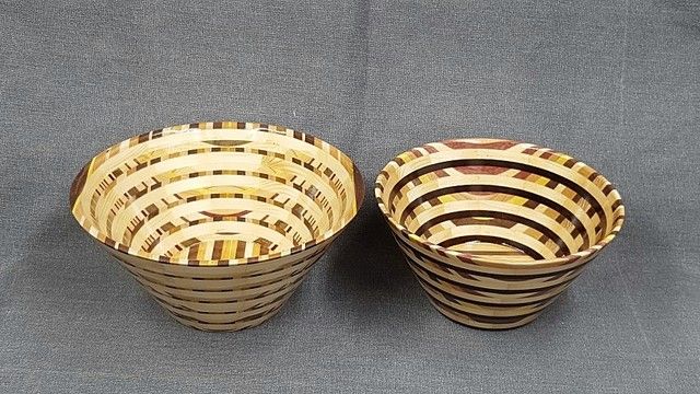 Yesterday I posted these left over scraps on my Woodworking Friends site left over from when I made a few dizzy bowls and said they would probably turn into a couple goofy looking bowls . Well I was wrong about them turning out goofy . They turned out better than expected when I finished them off today . .