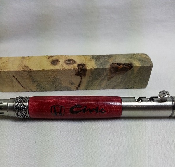 This was a custom order from a co-worker. His son is a "new age car guy", meaning he wrenches on cars like Hondas, Toyotas, etc. the J-body style cars. He has a pretty cool looking Honda Civic, that is tuned and modded pretty well. My co-worker saw some of my gearshift pens and heard that I also do engraving so his son asked for a Honda Civic engraved gearshift pen. I even found a blank that was pretty close to the color of his car!