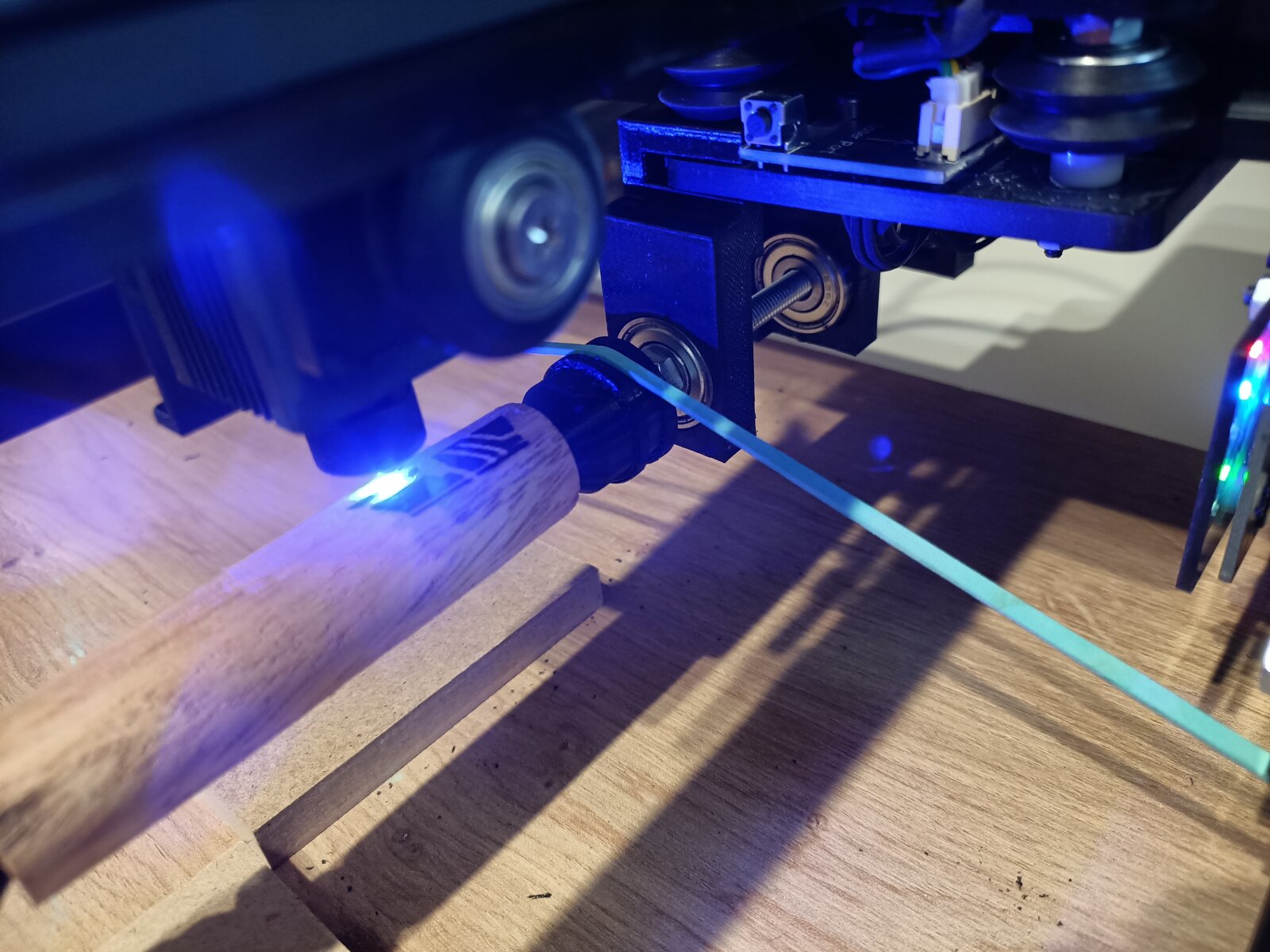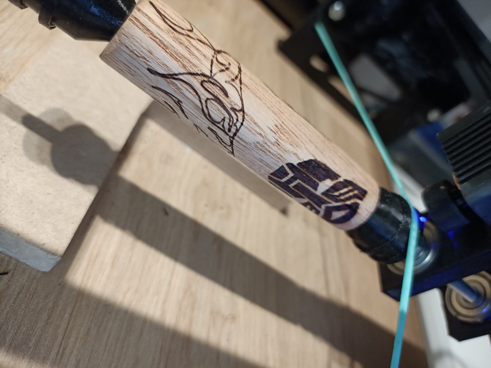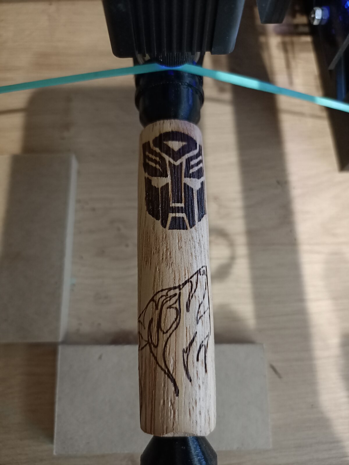 A few months ago I bought Neje Master 2 laser engraver. Now I have printed a rotary jig for it. A few months ago I bought a Neje Master 2 laser engraver. Now I have printed a rotary instrument for it. The first try looks promising! I need to change the rubber band to a toothed belt.