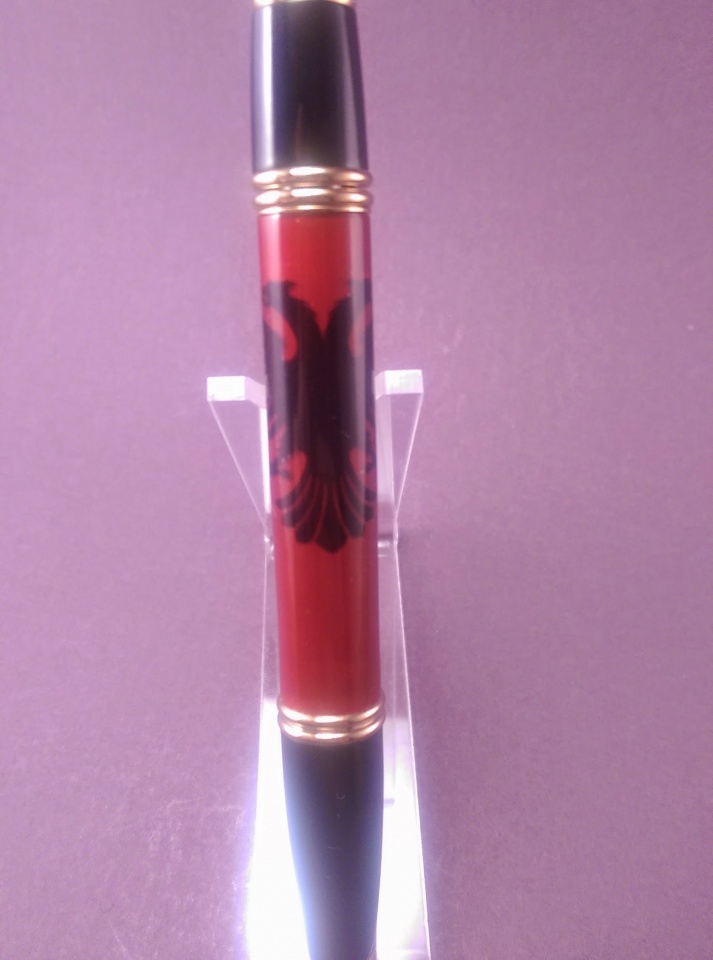 Was asked to create my vision of the Albanian flag. Went with a decal on an iridescent red blank. The decal gave me nothing but trouble. Once I got the technique for applying it smoothly figured out it started "silvering" as it dried. Many frustrated attempts later I googled the issue and discovered micro-set. And that solved the problem!