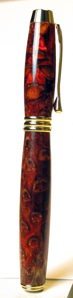 These are two of my castings made with two different species cones cast using clear epoxy resin. The red is a partially opened Sugar Pine cast with red metallic color. Because the wood was so dry and porous, the color was able to penetrate deep.
