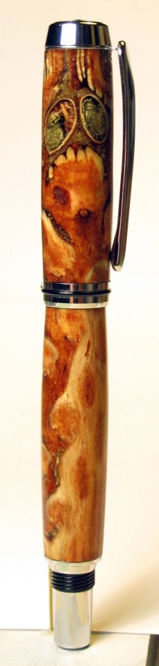 The lighter cone is a Knobby Pine and comes from a closed cone so the wood is very dense and hasn't oxidized. This is cast using gold and a couple of seed shells on the cap give it an interesting appearance. Because of the density, the gold formed small veins throughout instead of saturating the wood.