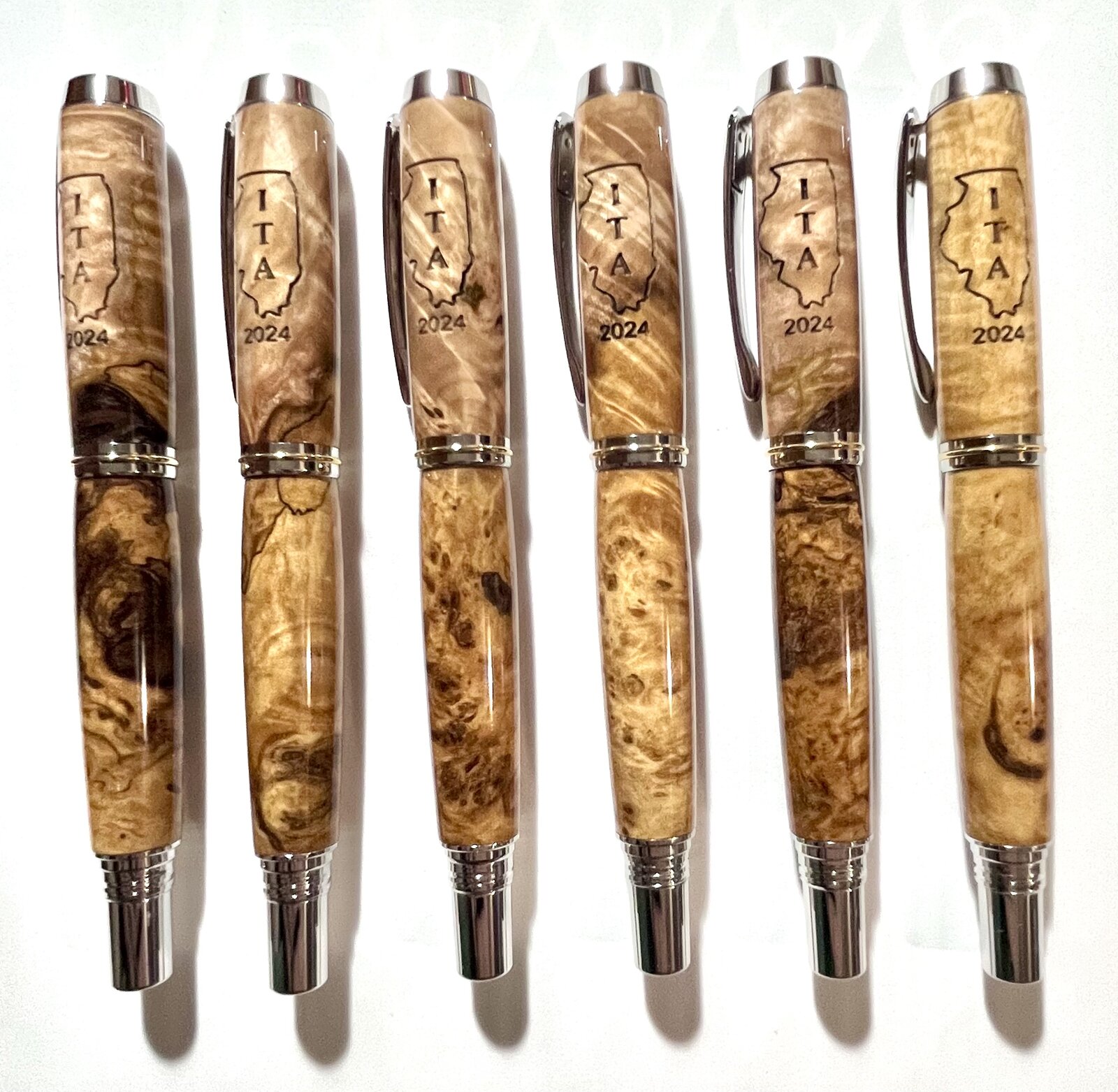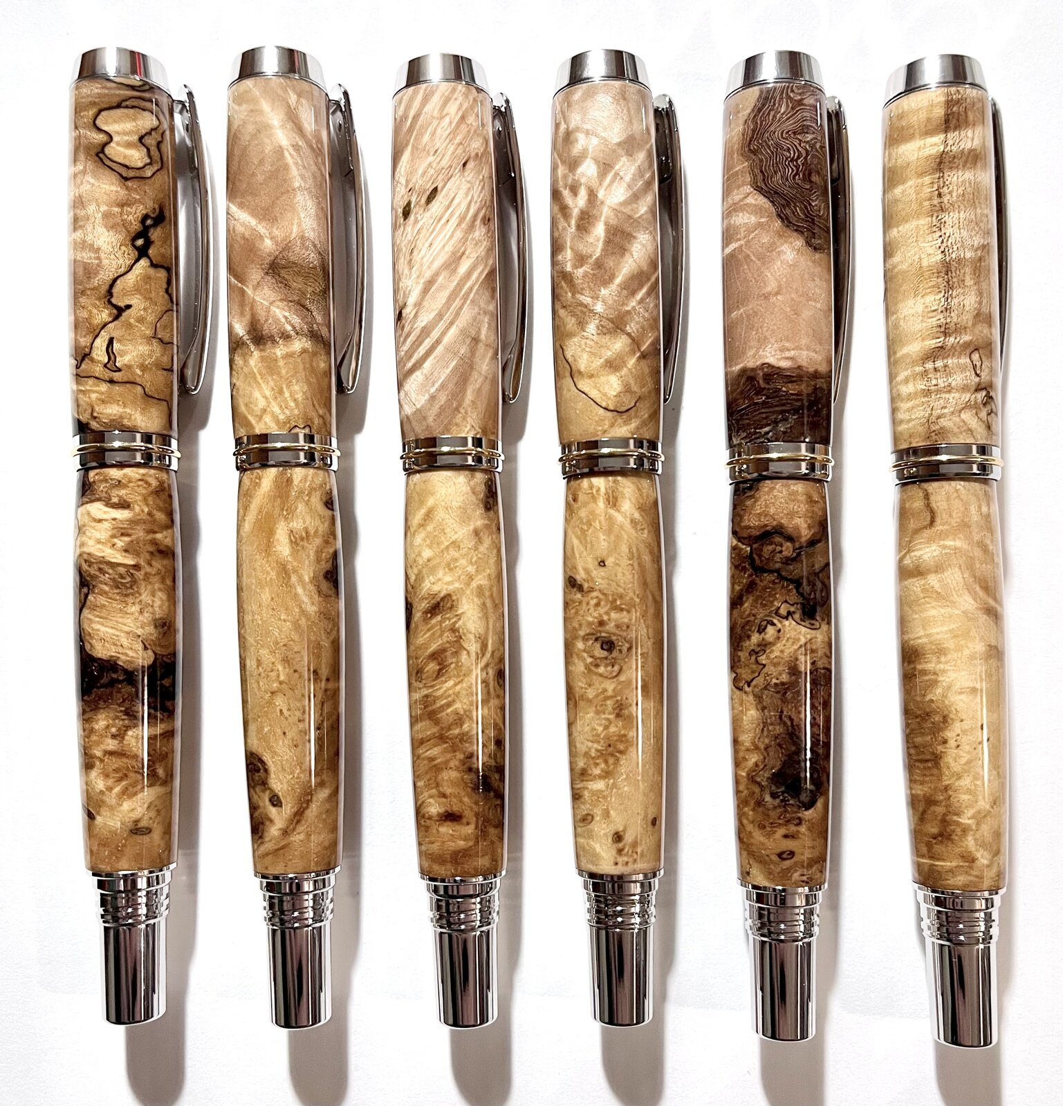 Every year I struggle to find something different or unique for one of my annual donations. I found these Maple blanks at last years MPG from Rich Coers ( low48 here, StudiorenWood on Etsy). He has some of the best wood blanks I have ever seen! Handpicking from the vendors is One reason to come to the MPG! I stabilized all of them to secure some of the character in the lower ends from blowing out during turning. All were dressed in Rhodium Jr Gents with a CA Gluboost finish. The caps were eventually engraved with logos of the organization they were donated to. Thanks again Rich and I look forward to seeing what you bring this year!