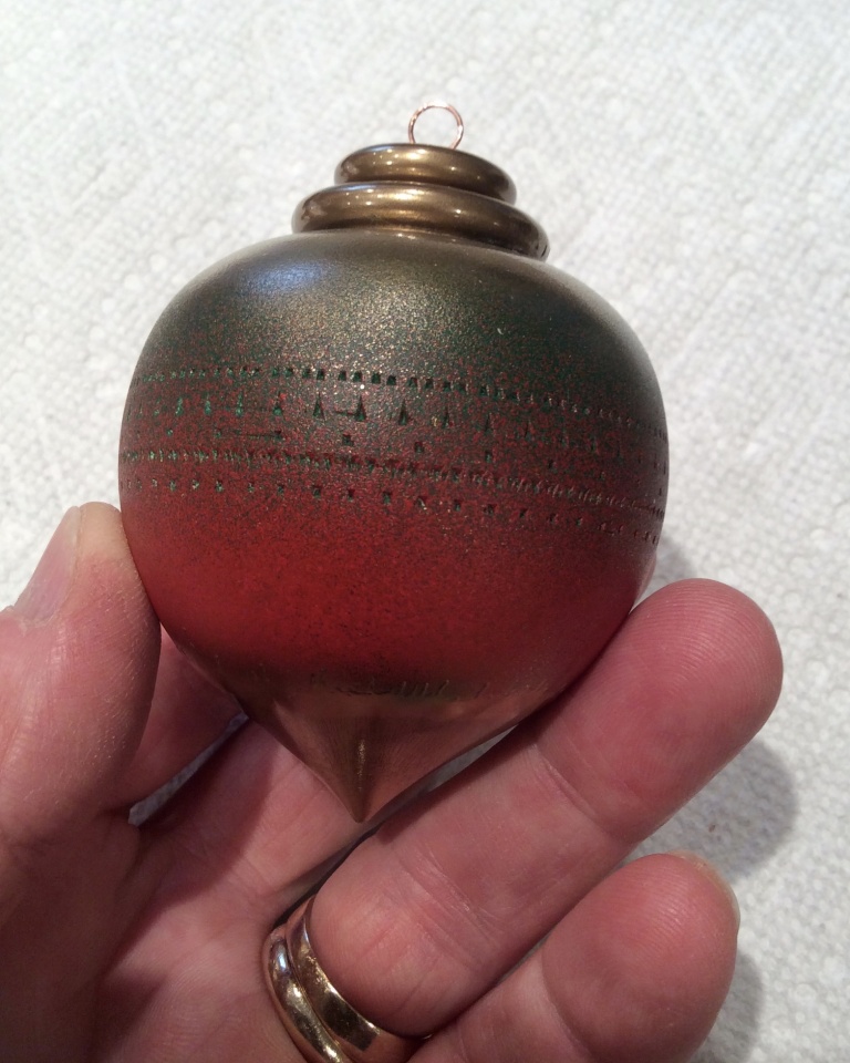 The orb ornament has a little texturing, is hollowed and has several jingle bells inside, and is finished with spray paints on the lathe. It weighs only 1.25 ounces.