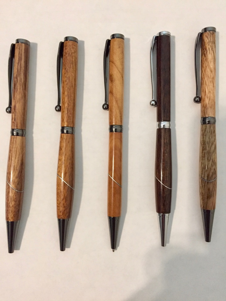 They are in order left-to-right, Koa, Koa, Apricot, Black Walnut, and Mango. They are Craft Supplies Apprentice Fancy Slimlines, and all were embellished with an inlay of metal set at about 30 degrees. Camera is just my iPhone, so it isn't anything fancy.