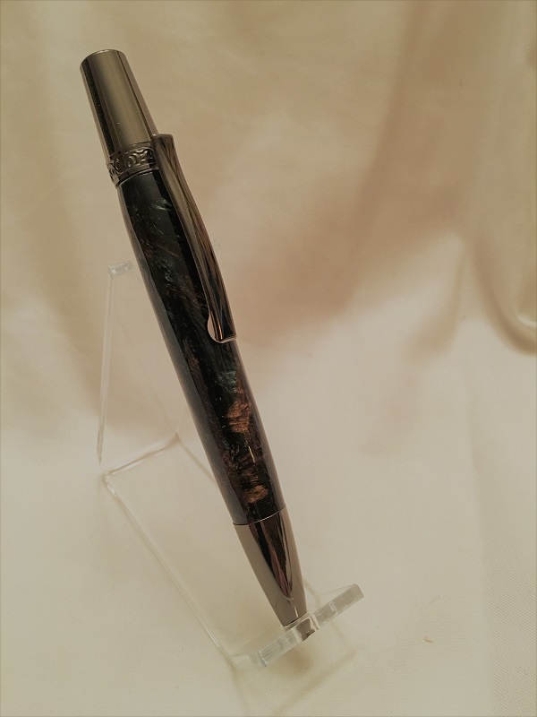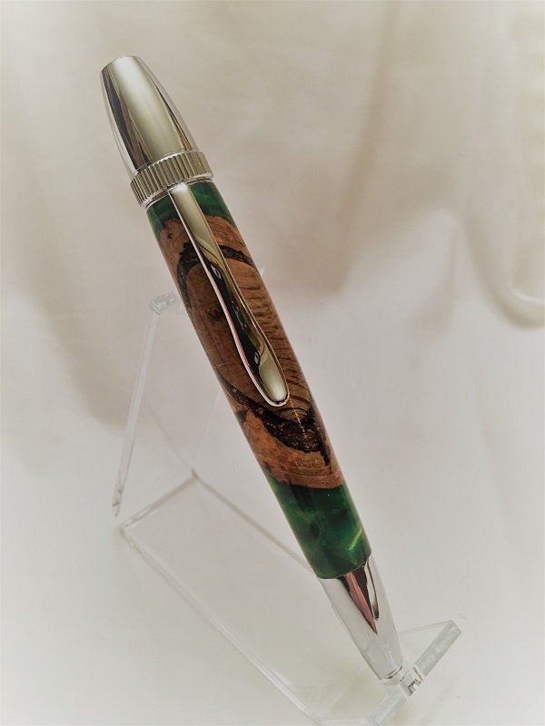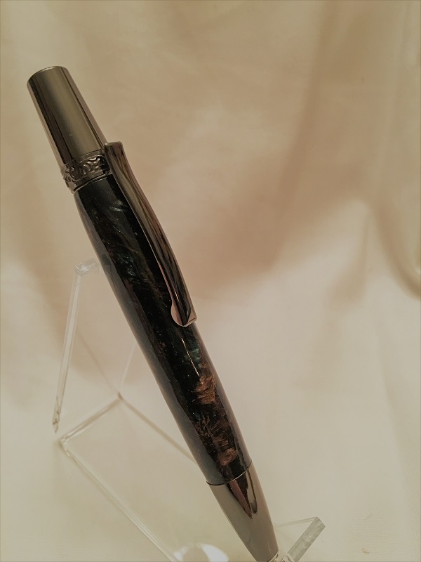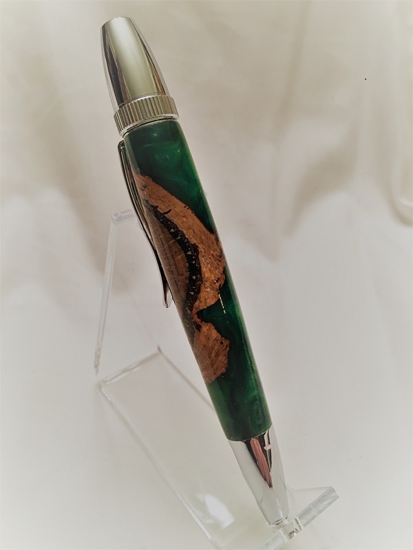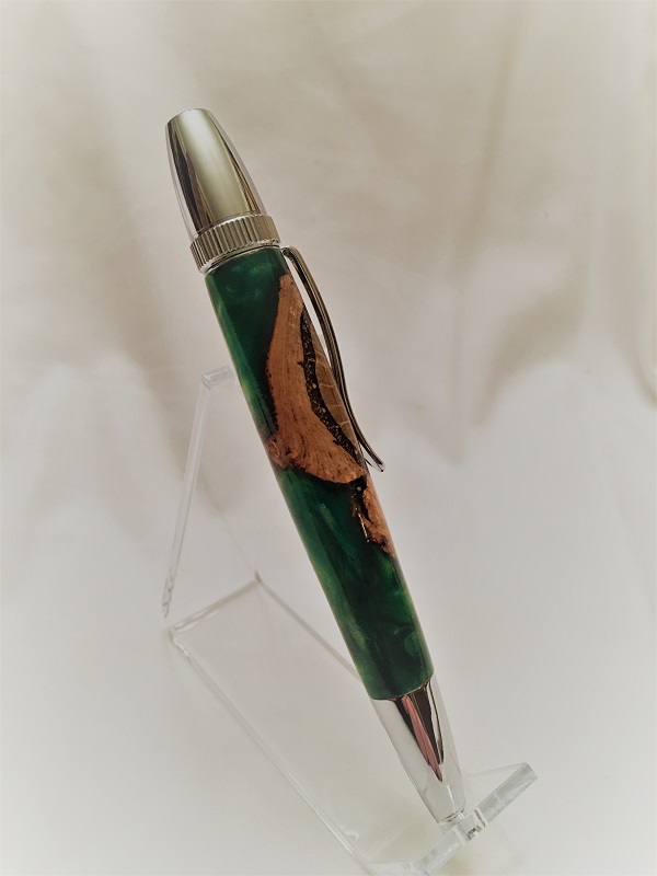 Have had a few busy weeks, but finally got back in the shop today. One of George's (Robutacion) blanks--unknown wood medallion cast in green, dressed in Patriot hardware. My first turning with cast wood--the sapwood was a wee tricky--but managed to finally get it done!!