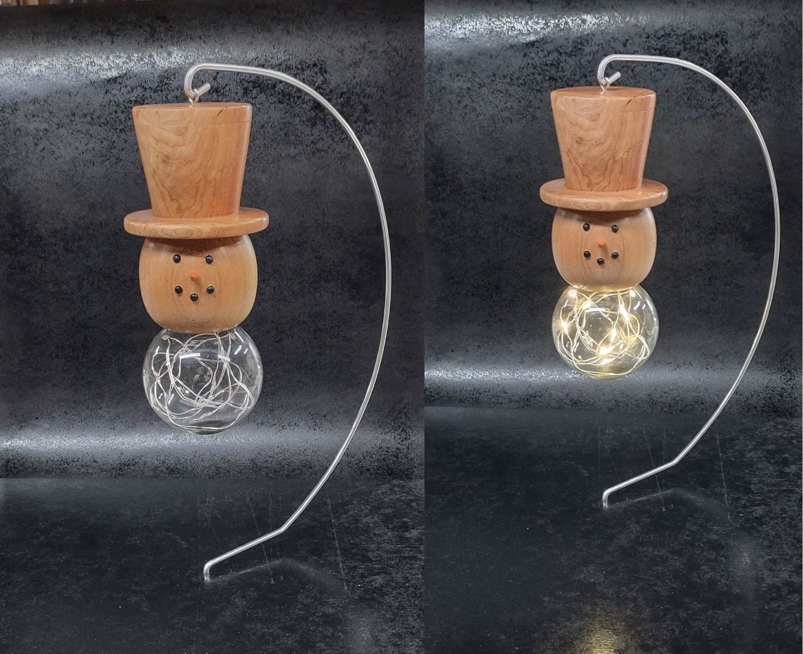 A couple of projects I have been working on. Our club challenge for October is something Halloween, so I made a scary Candy corn. The other is in preparation for our Christmas ornament exchange at the December meeting. A lighted Snowman ornament using fairy lights I found a Hobby Lobby. The hat has a hole drilled through it that holds the battery pack. The top of the hat is held on by rare earth magnets.