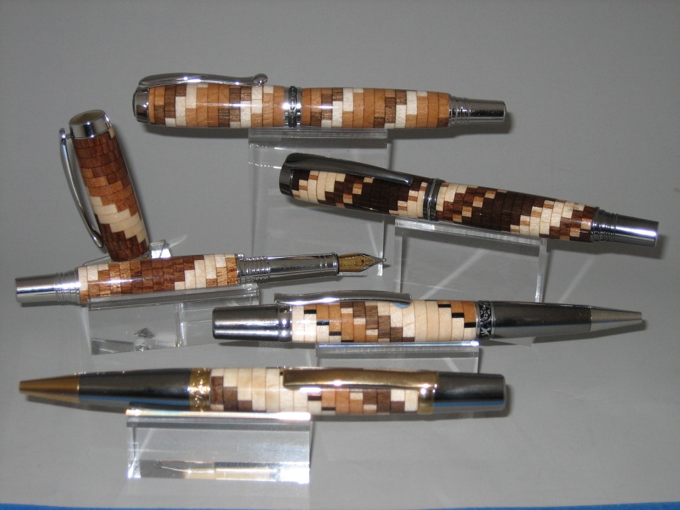 I made a segmented pen for a family Christmas gift, and then decided to make a few more. One Jr. Gent Fountain Pen, one Jr. Statesman Fountain Pen, one Jr. Gent Rollerball, and two Elegant Sierras. Woods used; walnut, cherry, maple, holly, peruvian walnut, wenge and african mahogany. As usual, not great photos. Comments are always welcome!