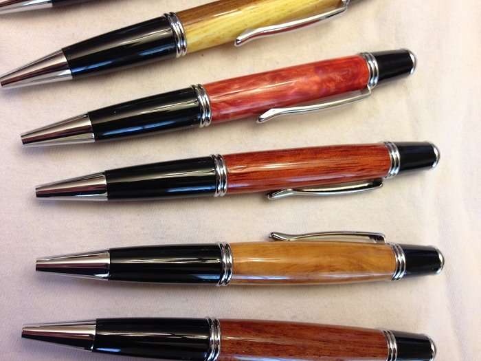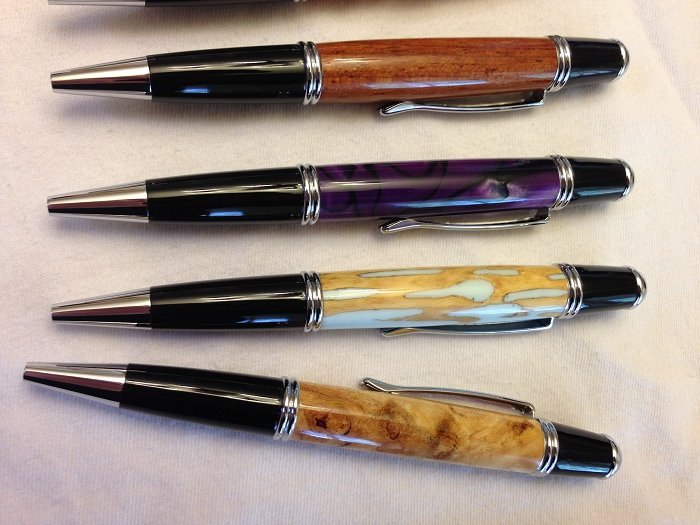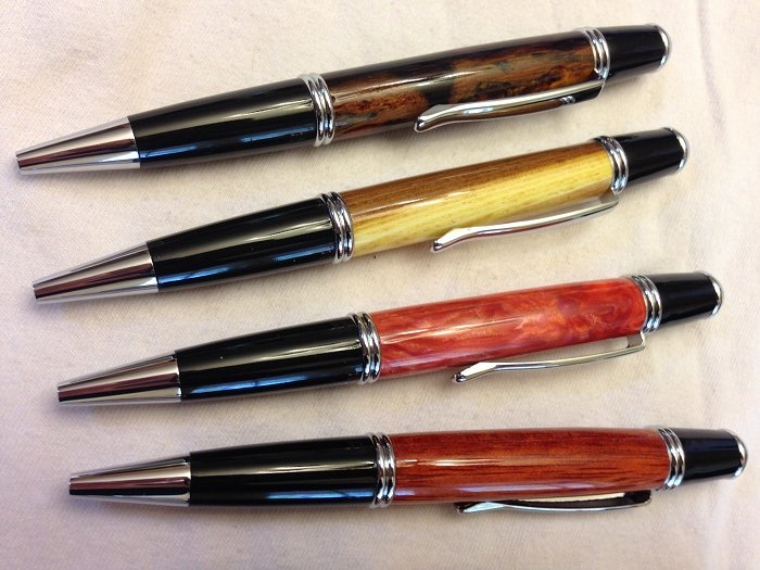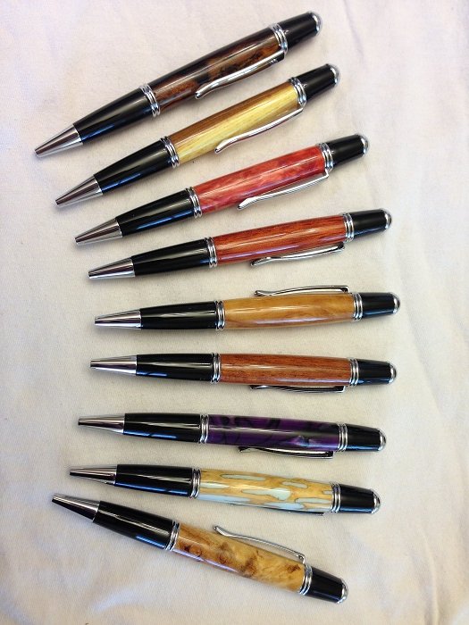 Gold Cast Desert Ironwood, Russian Olive, Red/Pink swirled Brooks blank, Bloodwood, Pecan (some curl), Jatoba/Brazilian Cherry, Purple Acrylic Acetate, Cholla, and Cherry Burl.