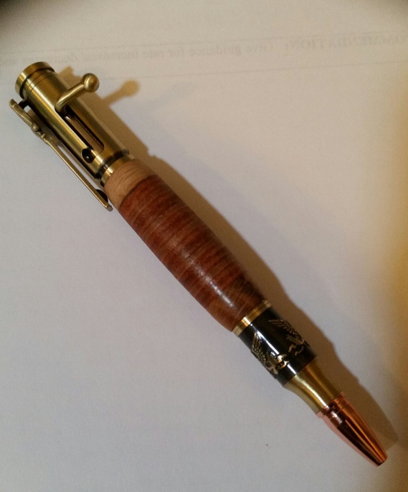 My younger brother is a leather worker. I asked him to punch some holes in some scraps and he came through. Attached is the result. There are about 30 layers of leather, sandwiched between two pieces of blackjack oak to give something solid to press against. Glued everything together one day and turned it the next. Put on 6 coats of thin CA so the leather was solid enough to sand smooth. Then another 8 coats to finish it. This is a prototype, Going to try another one on a different pen and see if I can get a "K-Bar handle" look to it.