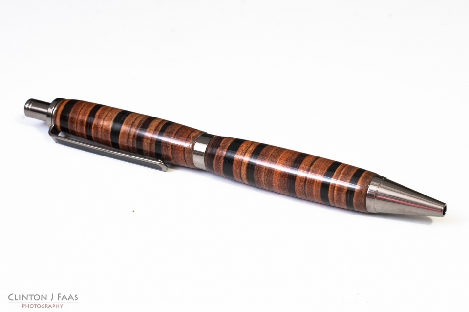 Had a customer want to incorporate alligator leather into a pen. I decided to stack it into my normal leather blank. It was extremely soft so i could not do too much but you can see it shown as each of the dark lines in the blanks. BTW, the spot just above the center band is a bad spot in the leather, not the finish.