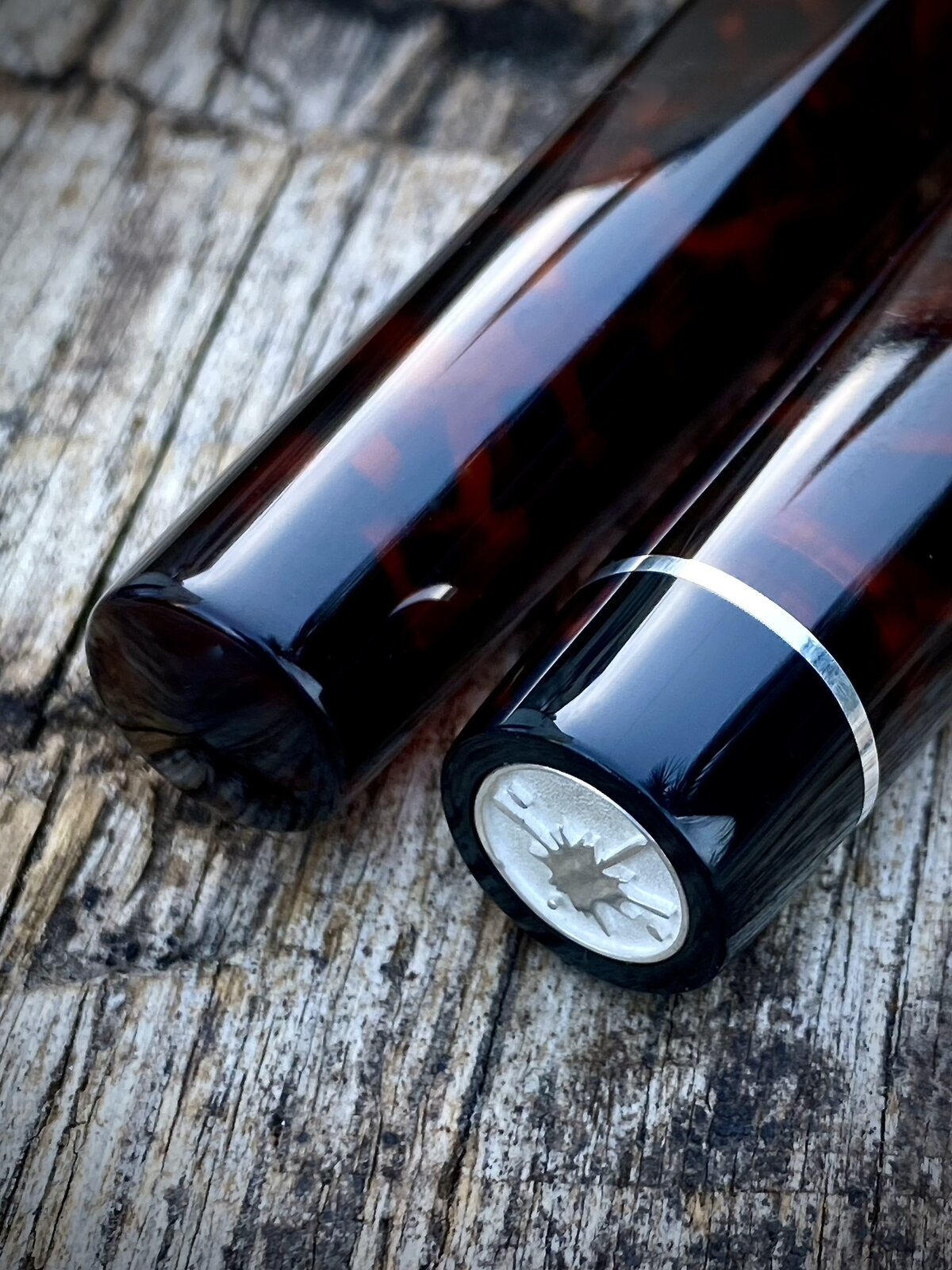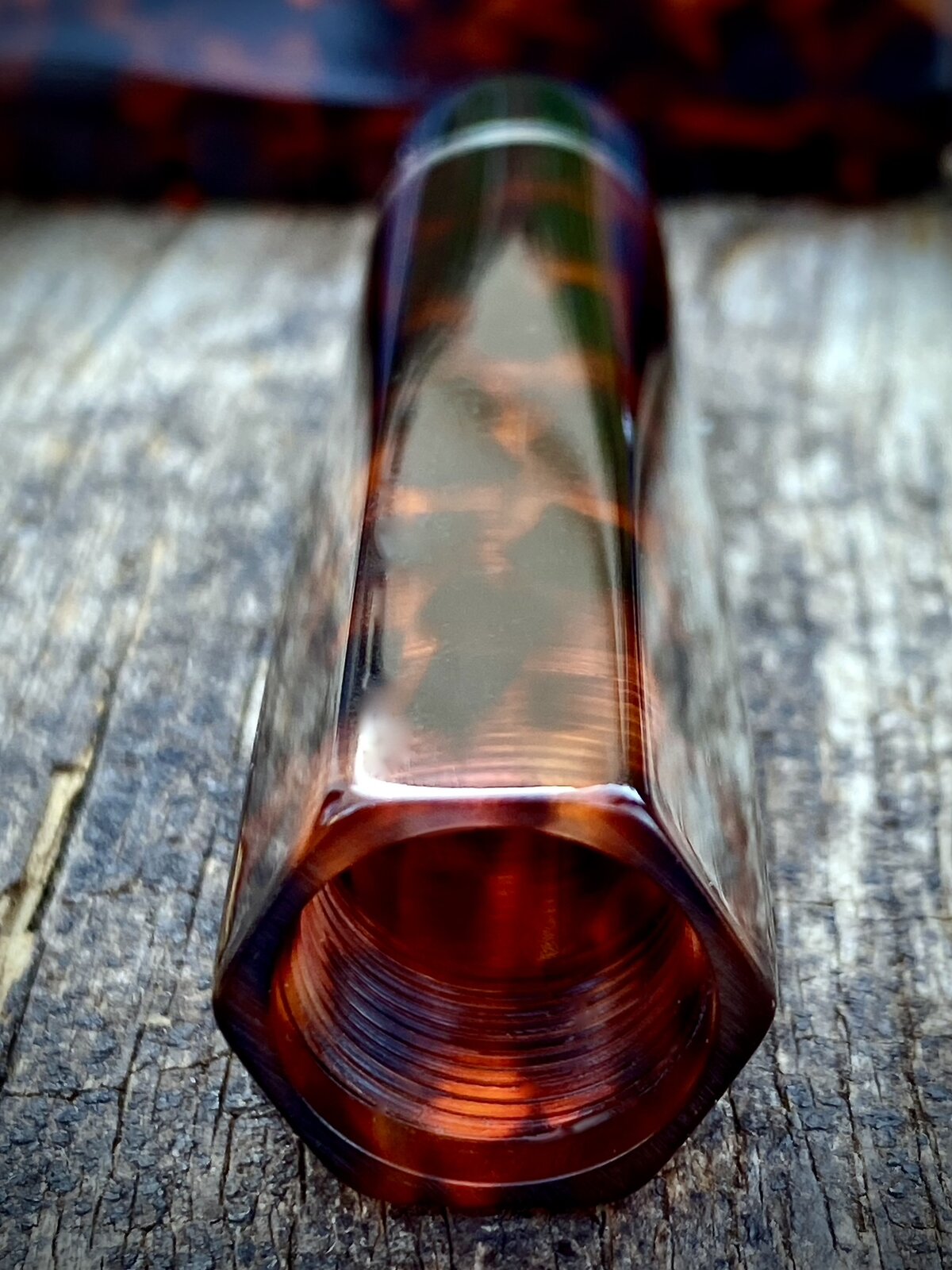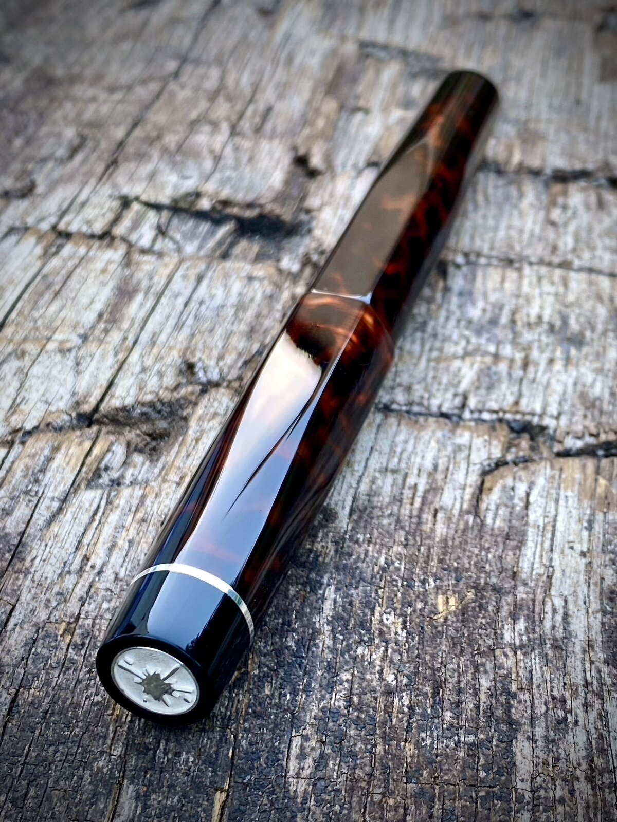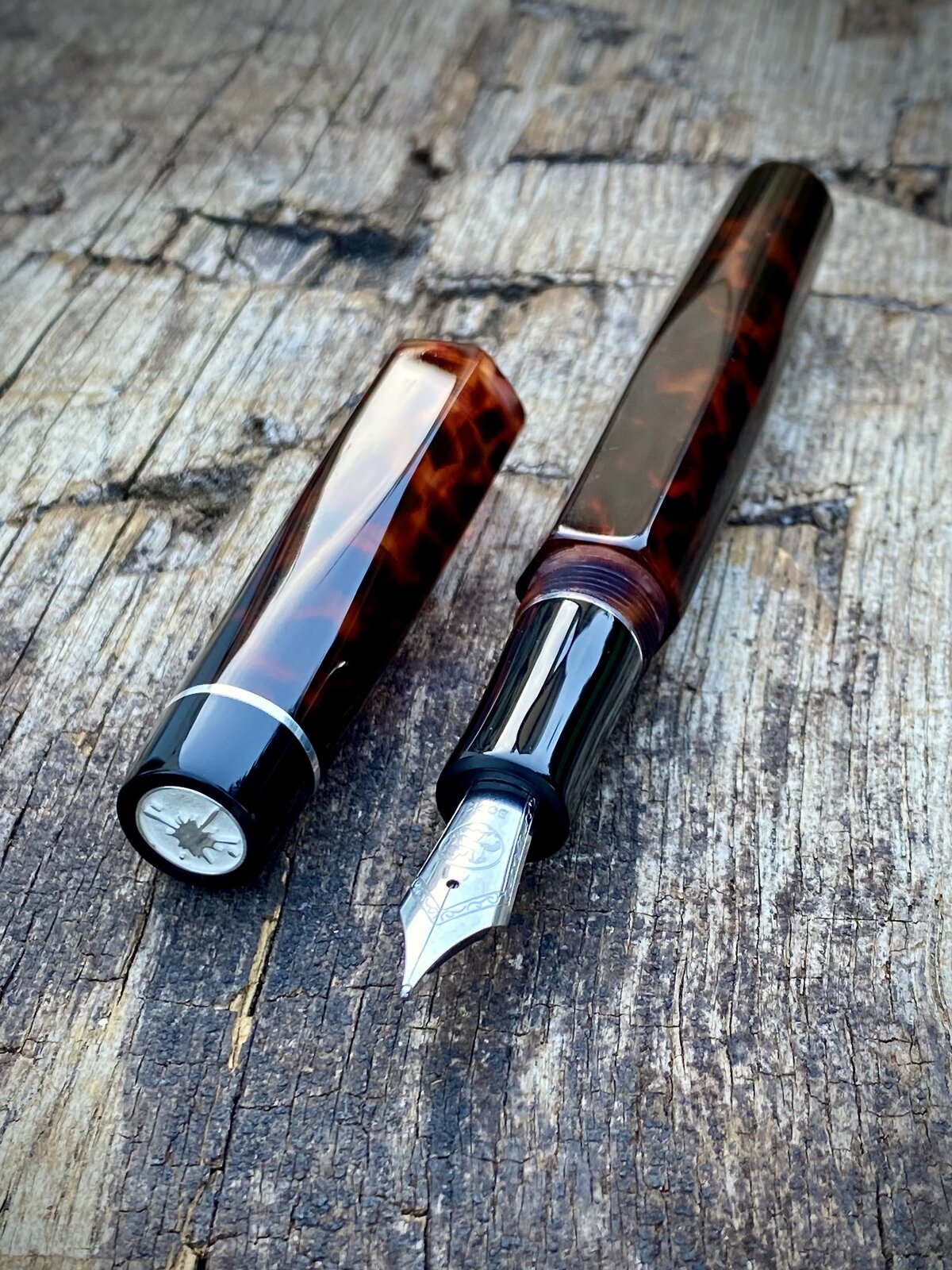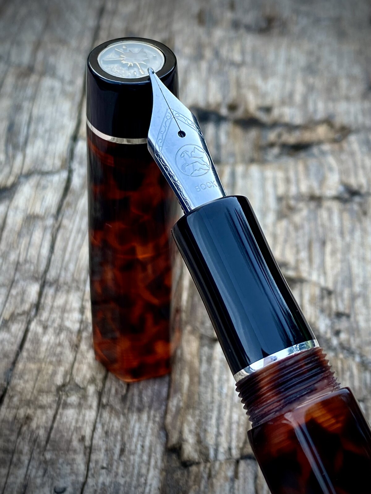 This pen has 13mm triple lead threads and a bit of sterling silver to finish it off. Hexagonal profile tapering to cylindrical ends. No clip on this one. Bock no6 nib fed by c/c.