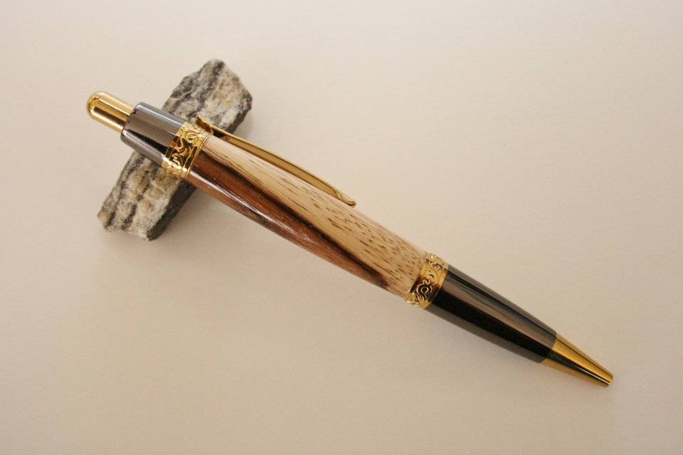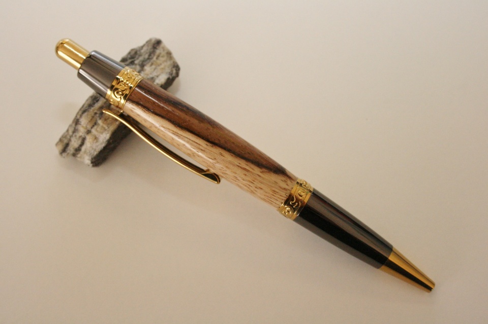 Our Sunday school teacher gave me some scrap wood for my pen making. In the mix was really nice piece of Zebrawood that had some heart wood. I thought it would make a nice pen for him. I used a Le Roi Elegant click in Gold Tn/Gun Metal. I sanded to 12000 mm and finished with about 20 coats of WTF over about 24 hours. All C&C are welcome.