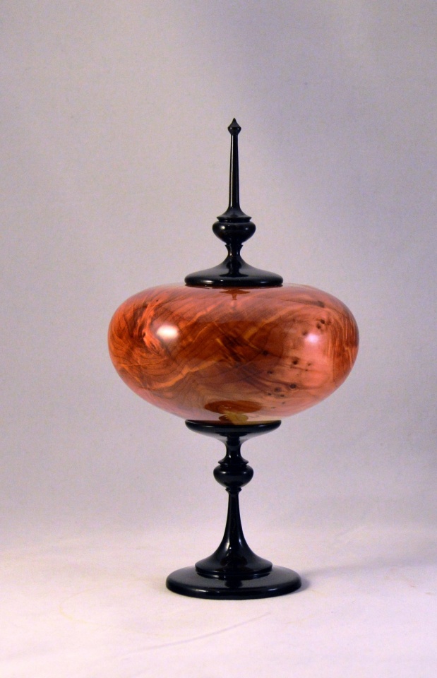 Just finished this lidded vessel, made form figured cedar and African blackwood. It is 9.5" tall and 4.5" wide.