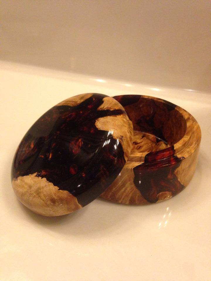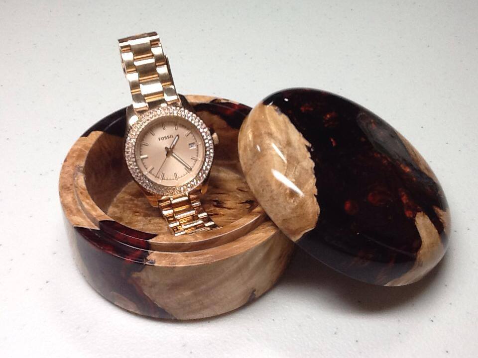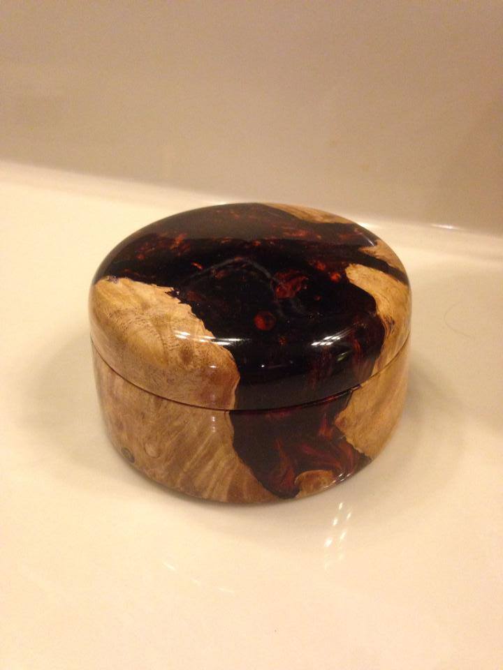 Turned this little jewelry box out of one of my blanks. Maple Burl cast in Alumilite Resin. CA finish and polished with micromesh