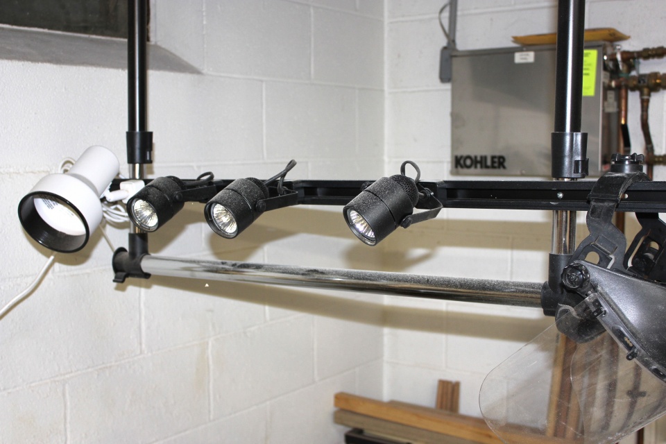 The racks are... Cloths Racks bought from ALDI's Grocery store - about $10 seasonally... Really cheap clothing racks. But cut up/ turned upside, mounted into the ceiling joists, voilla...a movable light rack. I added a Home Depot light bracket and as many lights as you want. Total deal... maybe 35-40 dollars.