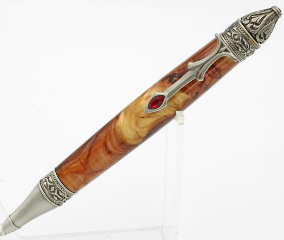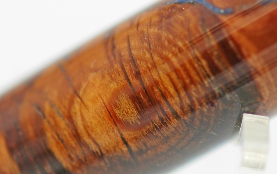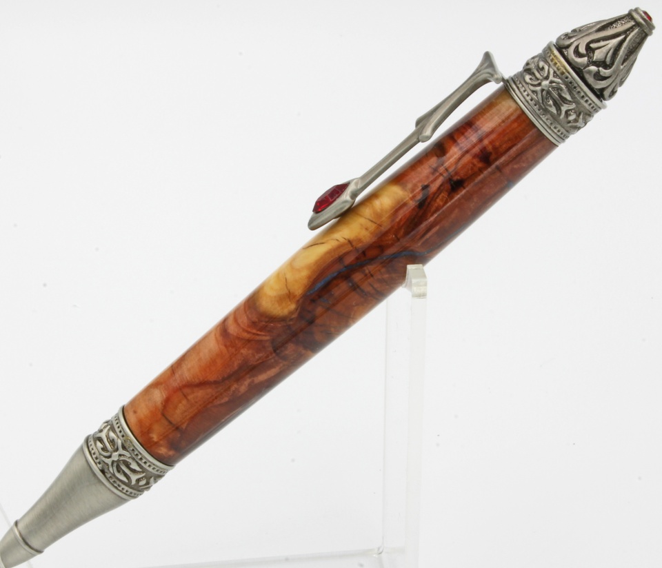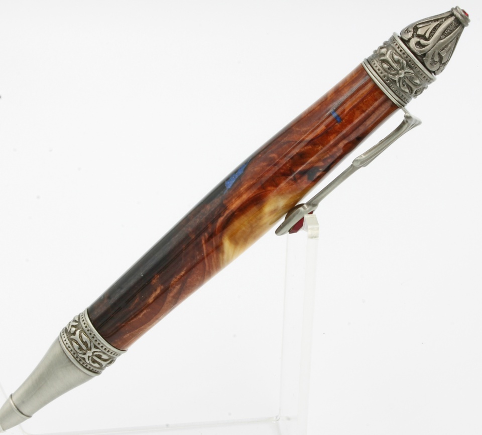 This one is made using wood from a redwood tree that was struck by lightning and completely destroyed. I crosscut it to try to capture the red and cream colors and also to try and get some of the charring from where the lightning struck. I was also able to get a knot dead center. I had to stabilize the pen twice to be sure it was able to be turned. I filled the checks with Blue Lapis.
