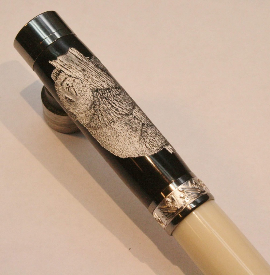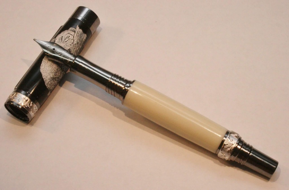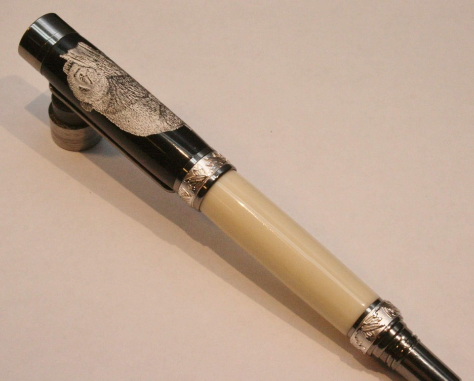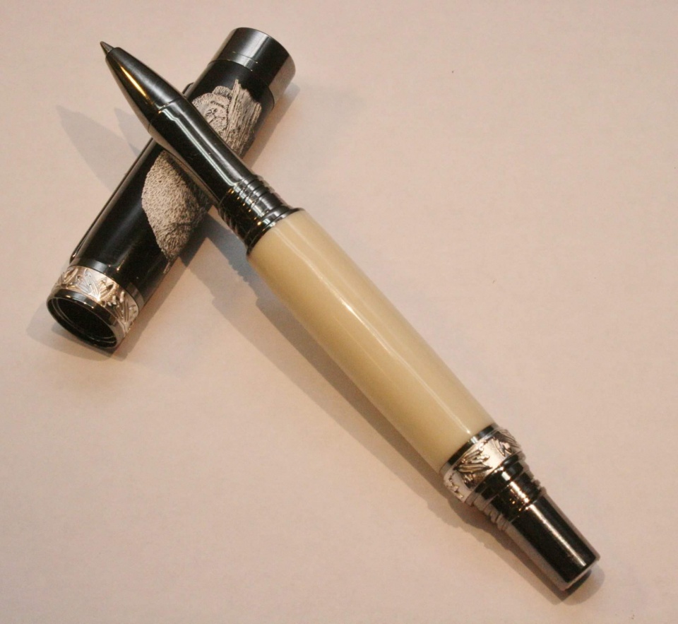 Here is a limited edition Panda fountain pen/ Rollerball. I got kit for Christmas and got the blanks from The Classic Nib, they are the only set of blanks of there kind. The top barrel is a Panda etched in Ebonite it arrived turned and polished the lower barrel is Alternative Ivory. I sanded the lower barrel to 12000mm and polished with Huts Plastic Polish. All C & C welcome