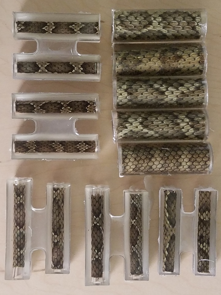 I've started doing my snake skins in Royal Palm. I cast a lot with PR, but for some reason could never get it to my liking with snake skin. Either tiny bubbles (which I don't normally have a problem with, or, even worse, I'd get a little "separation" between the resin and the snake skin at the ends of the tube.